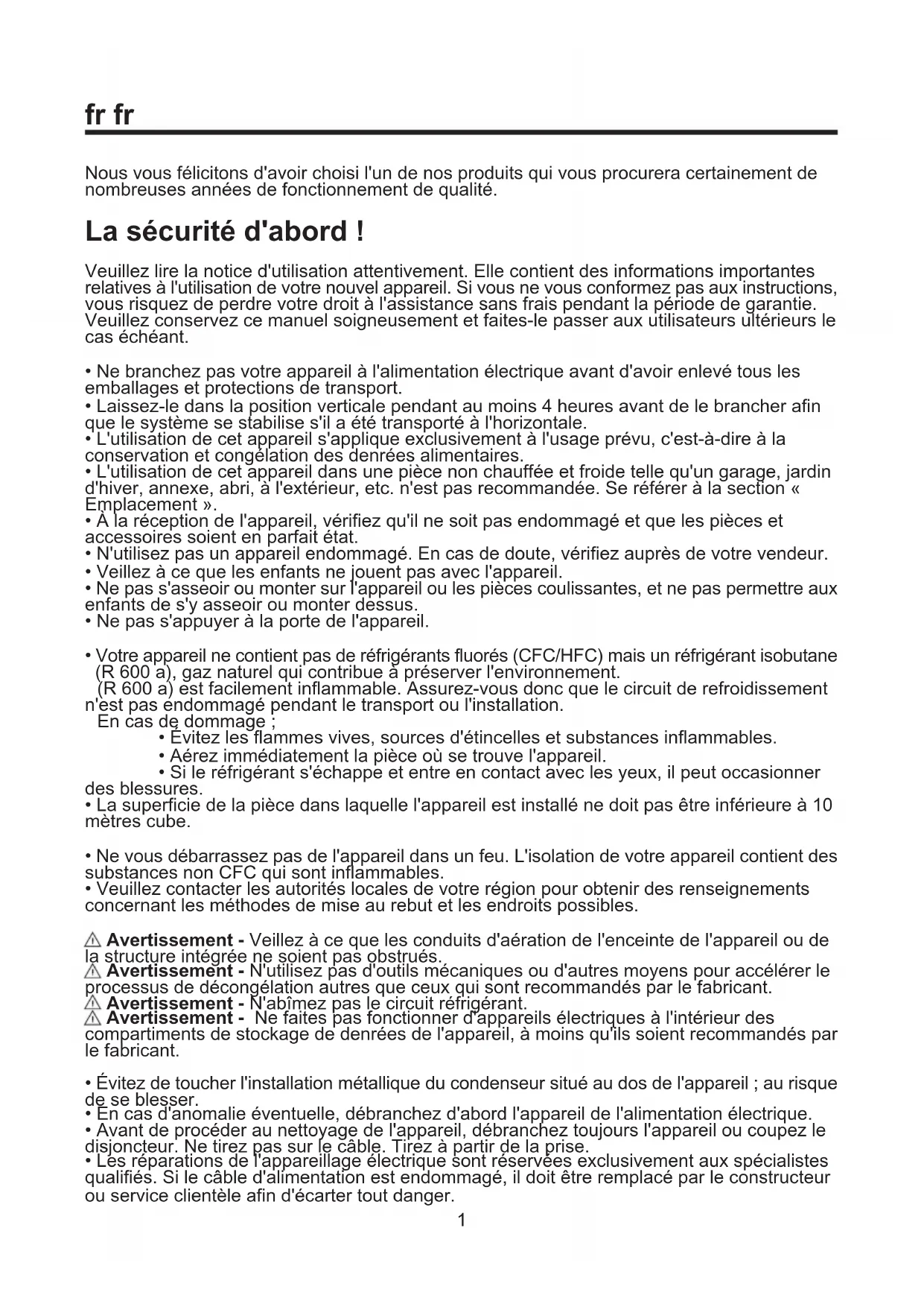 • Votre appareil ne contient pas de réfrigérants fluorés (CFC/HFC) mais un réfrigérant isobutane