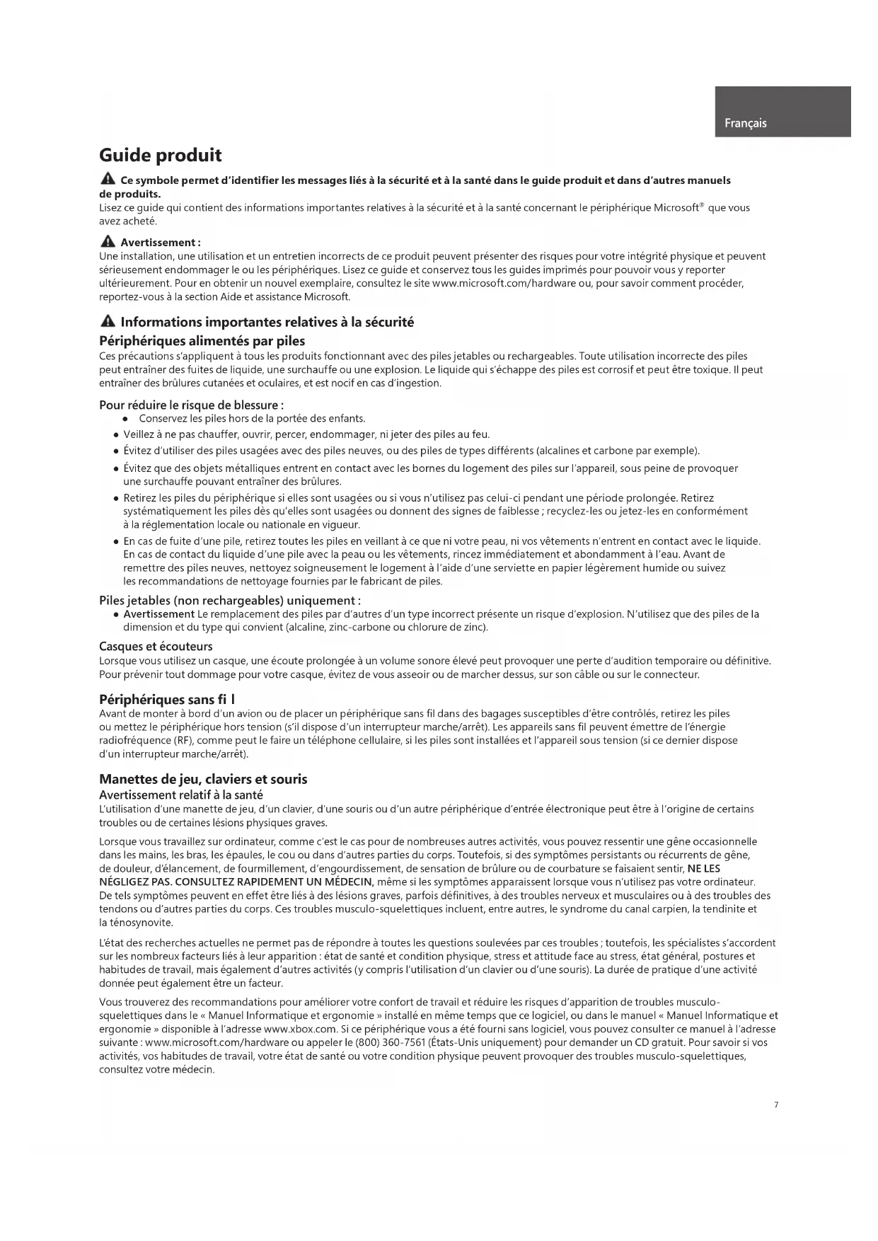 Une installation, une utilisation et un entretien incorrects de ce produit peuvent présenter des risques pour votre intégrité physique et peuvent sérieusement endommager le ou les périphériques. Lisez ce guide et conservez tous les guides imprimés pour pouvoir vous y reporter ultérieurement. Pour en obtenir un nouvel exemplaire, consultez le site www.microsoft.com/hardware ou, pour savoir comment procéder, reportez-vous à la section Aide et assistance Microsoft. Informations importantes relatives à la sécurité Périphériques alimentés par piles Ces précautions s’appliquent à tous les produits fonctionnant avec des piles jetables ou rechargeables. Toute utilisation incorrecte des piles peut entraîner des fuites de liquide, une surchauffe ou une explosion. Le liquide qui s’échappe des piles est corrosif et peut être toxique. Il peut entraîner des brûlures cutanées et oculaires, et est nocif en cas d’ingestion. Pour réduire le risque de blessure : ● Conservez les piles hors de la portée des enfants. ● Veillez à ne pas chauffer, ouvrir, percer, endommager, ni jeter des piles au feu. ● Évitez d’utiliser des piles usagées avec des piles neuves, ou des piles de types différents (alcalines et carbone par exemple). ● Évitez que des objets métalliques entrent en contact avec les bornes du logement des piles sur l’appareil, sous peine de provoquer une surchauffe pouvant entraîner des brûlures. ● Retirez les piles du périphérique si elles sont usagées ou si vous n’utilisez pas celui-ci pendant une période prolongée. Retirez systématiquement les piles dès qu’elles sont usagées ou donnent des signes de faiblesse ; recyclez-les ou jetez-les en conformément à la réglementation locale ou nationale en vigueur. ● En cas de fuite d’une pile, retirez toutes les piles en veillant à ce que ni votre peau, ni vos vêtements n’entrent en contact avec le liquide. En cas de contact du liquide d’une pile avec la peau ou les vêtements, rincez immédiatement et abondamment à l’eau. Avant de remettre des piles neuves, nettoyez soigneusement le logement à l’aide d’une serviette en papier légèrement humide ou suivez les recommandations de nettoyage fournies par le fabricant de piles. Piles jetables (non rechargeables) uniquement : ● Avertissement Le remplacement des piles par d’autres d’un type incorrect présente un risque d’explosion. N’utilisez que des piles de la dimension et du type qui convient (alcaline, zinc-carbone ou chlorure de zinc). Casques et écouteurs Lorsque vous utilisez un casque, une écoute prolongée à un volume sonore élevé peut provoquer une perte d’audition temporaire ou défi nitive. Pour prévenir tout dommage pour votre casque, évitez de vous asseoir ou de marcher dessus, sur son câble ou sur le connecteur. Périphériques sans fi l Avant de monter à bord d’un avion ou de placer un périphérique sans fi l dans des bagages susceptibles d’être contrôlés, retirez les piles ou mettez le périphérique hors tension (s’il dispose d’un interrupteur marche/arrêt). Les appareils sans fi l peuvent émettre de l’énergie radiofréquence (RF), comme peut le faire un téléphone cellulaire, si les piles sont installées et l’appareil sous tension (si ce dernier dispose d’un interrupteur marche/arrêt). Manettes de jeu, claviers et souris Avertissement relatif à la santé L’utilisation d’une manette de jeu, d’un clavier, d’une souris ou d’un autre périphérique d’entrée électronique peut être à l’origine de certains troubles ou de certaines lésions physiques graves. Lorsque vous travaillez sur ordinateur, comme c’est le cas pour de nombreuses autres activités, vous pouvez ressentir une gêne occasionnelle dans les mains, les bras, les épaules, le cou ou dans d’autres parties du corps. Toutefois, si des symptômes persistants ou récurrents de gêne, de douleur, d’élancement, de fourmillement, d’engourdissement, de sensation de brûlure ou de courbature se faisaient sentir, NE LES NÉGLIGEZ PAS. CONSULTEZ RAPIDEMENT UN MÉDECIN, même si les symptômes apparaissent lorsque vous n’utilisez pas votre ordinateur. De tels symptômes peuvent en effet être liés à des lésions graves, parfois défi nitives, à des troubles nerveux et musculaires ou à des troubles des tendons ou d’autres parties du corps. Ces troubles musculo-squelettiques incluent, entre autres, le syndrome du canal carpien, la tendinite et la ténosynovite. L’état des recherches actuelles ne permet pas de répondre à toutes les questions soulevées par ces troubles ; toutefois, les spécialistes s’accordent sur les nombreux facteurs liés à leur apparition : état de santé et condition physique, stress et attitude face au stress, état général, postures et habitudes de travail, mais également d’autres activités (y compris l’utilisation d’un clavier ou d’une souris). La durée de pratique d’une activité donnée peut également être un facteur. Vous trouverez des recommandations pour améliorer votre confort de travail et réduire les risques d’apparition de troubles musculo- squelettiques dans le « Manuel Informatique et ergonomie » installé en même temps que ce logiciel, ou dans le manuel « Manuel Informatique et ergonomie » disponible à l’adresse www.xbox.com. Si ce périphérique vous a été fourni sans logiciel, vous pouvez consulter ce manuel à l’adresse suivante : www.microsoft.com/hardware ou appeler le (800) 360-7561 (États-Unis uniquement) pour demander un CD gratuit. Pour savoir si vos activités, vos habitudes de travail, votre état de santé ou votre condition physique peuvent provoquer des troubles musculo-squelettiques, consultez votre médecin. Français8 Crises d’épilepsie liées à la photosensibilité Pour un très faible pourcentage de personnes, l’exposition à certaines images, notamment les lumières ou les motifs clign
