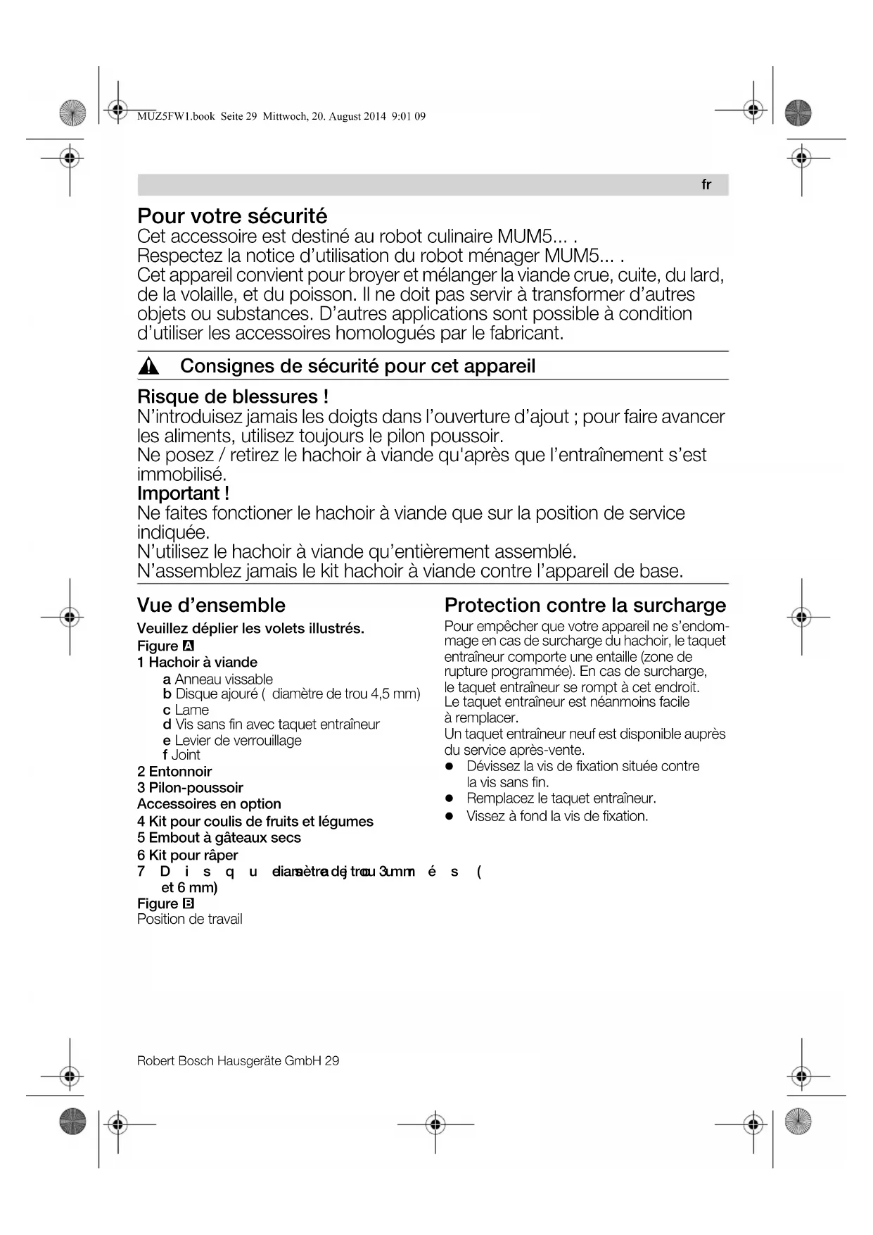 Subject to alterations. MUZ5FW1.book Seite 28 Mittwoch, 20. August 2014 9:01 09Robert Bosch Hausgeräte GmbH 29 Pour votre sécurité Cet accessoire est destiné au robot culinaire MUM5... . Respectez la notice d’utilisation du robot ménager MUM5... . Cet appareil convient pour broyer et mélanger la viande crue, cuite, du lard, de la volaille, et du poisson. Il ne doit pas servir à transformer d’autres objets ou substances. D’autres applications sont possible à condition d’utiliser les accessoires homologués par le fabricant. , Consignes de sécurité pour cet appareil Risque de blessures ! N’introduisez jamais les doigts dans l’ouverture d’ajout ; pour faire avancer les aliments, utilisez toujours le pilon poussoir. Ne posez / retirez le hachoir à viande qu'après que l’entraînement s’est immobilisé. Important ! Ne faites fonctioner le hachoir à viande que sur la position de service indiquée. N’utilisez le hachoir à viande qu’entièrement assemblé. N’assemblez jamais le kit hachoir à viande contre l’appareil de base. Vue d’ensemble Veuillez déplier les volets illustrés. Figure 1 Hachoir à viande a Anneau vissable b Disque ajouré ( diamètre de trou 4,5 mm
