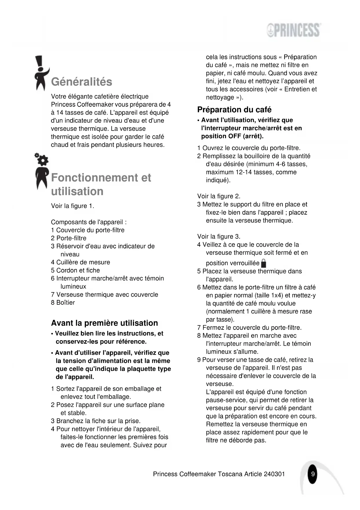 - 2002/96/EC9 Princess Coffeemaker Toscana Article 240301 Généralités Votre élégante cafetière électrique Princess Coffeemaker vous préparera de 4 à 14 tasses de café. L'appareil est équipé d'un indicateur de niveau d'eau et d'une verseuse thermique. La verseuse thermique est isolée pour garder le café chaud et frais pendant plusieurs heures. Fonctionnement et utilisation Voir la figure 1. Composants de l'appareil : 1 Couvercle du porte-filtre 2 Porte-filtre 3 Réservoir d'eau avec indicateur de niveau 4 Cuillère de mesure 5 Cordon et fiche 6 Interrupteur marche/arrêt avec témoin lumineux 7 Verseuse thermique avec couvercle 8 Boîtier Avant la première utilisation