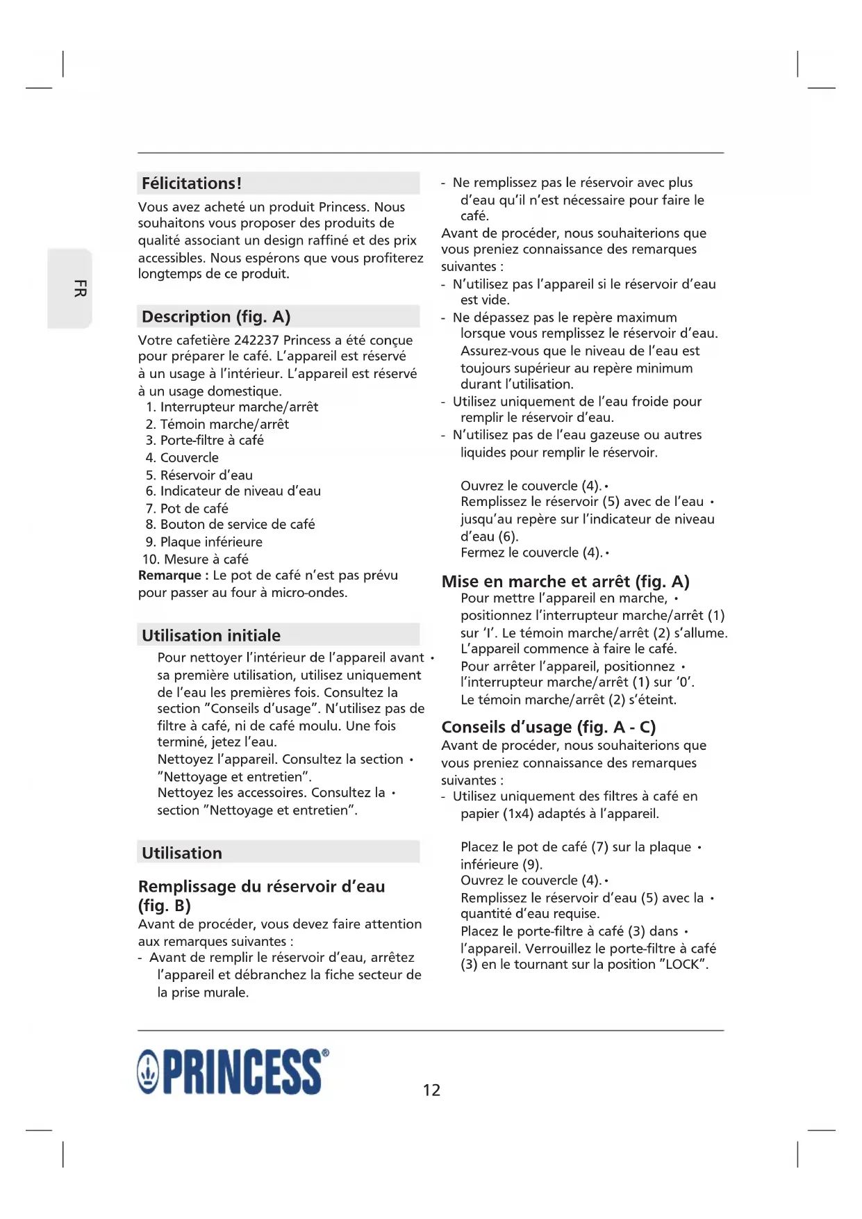 Félicitations! Vous avez acheté un produit Princess. Nous souhaitons vous proposer des produits de qualité associant un design raffiné et des prix accessibles. Nous espérons que vous profiterez longtemps de ce produit. Description (fig. A) Votre cafetière 242237 Princess a été conçue pour préparer le café. L’appareil est réservé à un usage à l’intérieur. L’appareil est réservé à un usage domestique.