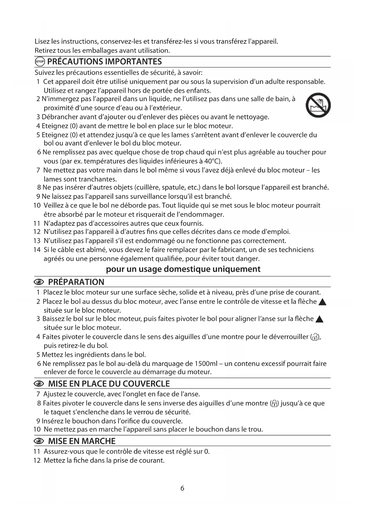 6 Ne remplissez pas le bol au-delà du marquage de 1500ml – un contenu excessif pourrait faire