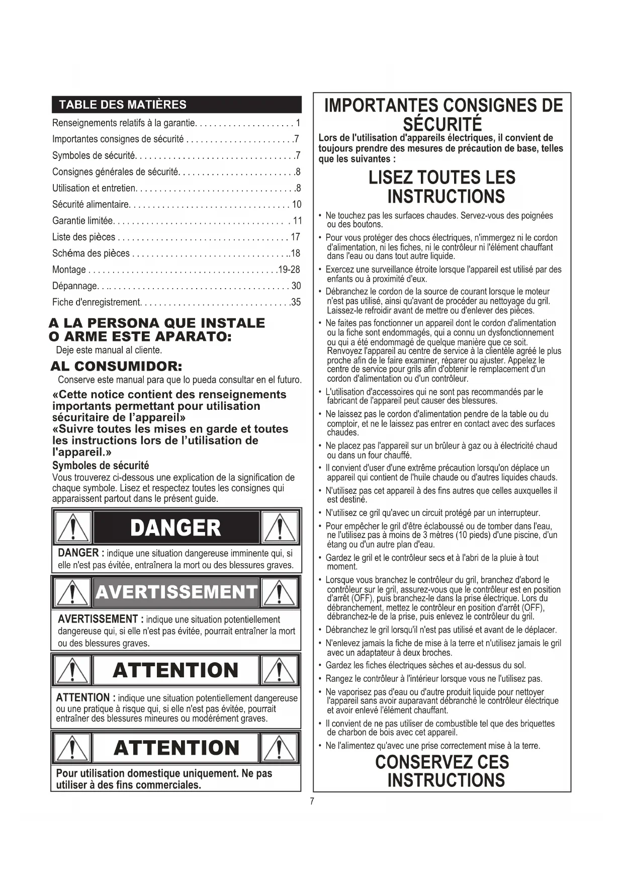 IMPORTANTES CONSIGNES DE SÉCURITÉ A LA PERSONA QUE INSTALE O ARME ESTE APARATO: Conserve este manual para que lo pueda consultar en el futuro. AL CONSUMIDOR: Deje este manual al cliente. 7Consignes générales de sécurité