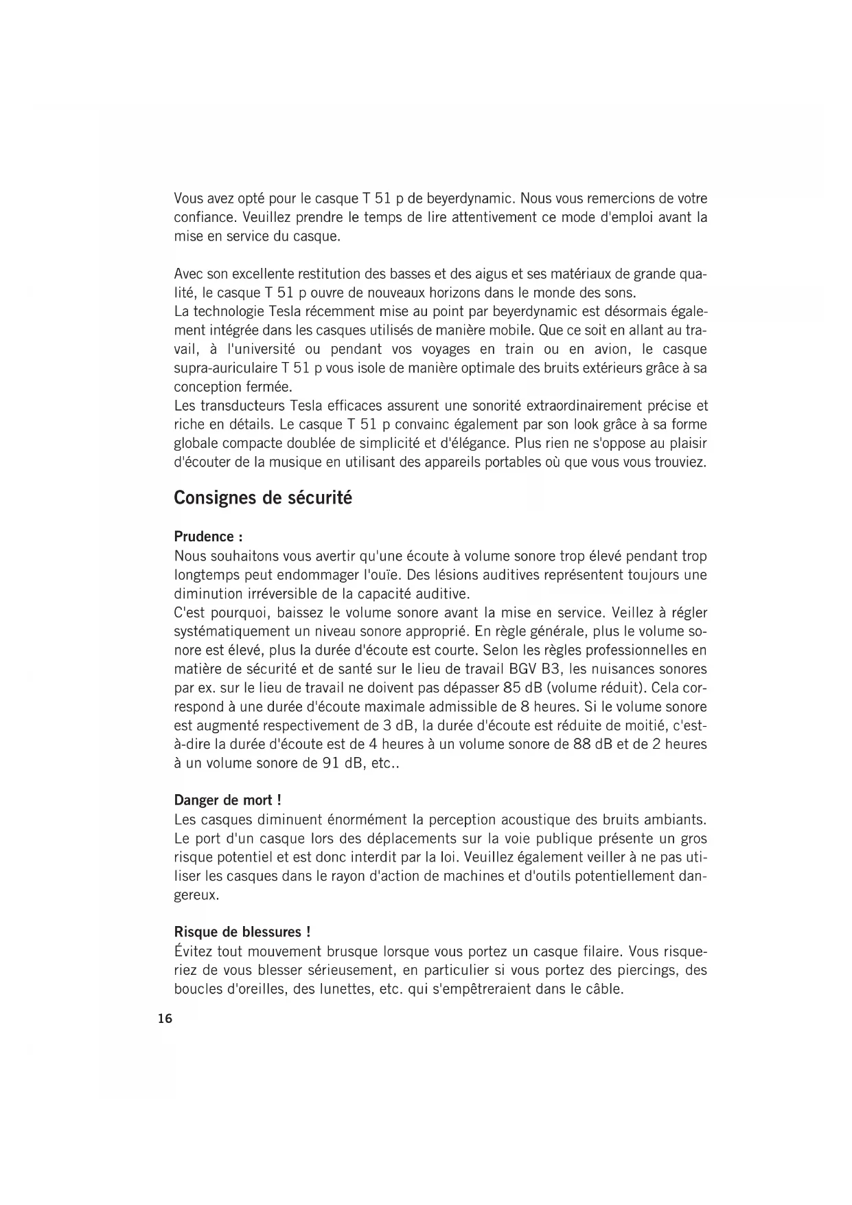 - Desprenda la película protectora de la nueva almohadilla y péguela.16 Vous avez opté pour le casque T 51 p de beyerdynamic. Nous vous remercions de votre confiance. Veuillez prendre le temps de lire attentivement ce mode d'emploi avant la mise en service du casque. Avec son excellente restitution des basses et des aigus et ses matériaux de grande qua- lité, le casque T 51 p ouvre de nouveaux horizons dans le monde des sons. La technologie Tesla récemment mise au point par beyerdynamic est désormais égale- ment intégrée dans les casques utilisés de manière mobile. Que ce soit en allant au tra- vail, à l'université ou pendant vos voyages en train ou en avion, le casque supra-auriculaire T 51 p vous isole de manière optimale des bruits extérieurs grâce à sa conception fermée. Les transducteurs Tesla efficaces assurent une sonorité extraordinairement précise et riche en détails. Le casque T 51 p convainc également par son look grâce à sa forme globale compacte doublée de simplicité et d'élégance. Plus rien ne s'oppose au plaisir d'écouter de la musique en utilisant des appareils portables où que vous vous trouviez. Consignes de sécurité Prudence : Nous souhaitons vous avertir qu'une écoute à volume sonore trop élevé pendant trop longtemps peut endommager l'ouïe. Des lésions auditives représentent toujours une diminution irréversible de la capacité auditive. C'est pourquoi, baissez le volume sonore avant la mise en service. Veillez à régler systématiquement un niveau sonore approprié. En règle générale, plus le volume so- nore est élevé, plus la durée d'écoute est courte. Selon les règles professionnelles en matière de sécurité et de santé sur le lieu de travail BGV B3, les nuisances sonores par ex. sur le lieu de travail ne doivent pas dépasser 85 dB (volume réduit). Cela cor- respond à une durée d'écoute maximale admissible de 8 heures. Si le volume sonore est augmenté respectivement de 3 dB, la durée d'écoute est réduite de moitié, c'est- à-dire la durée d'écoute est de 4 heures à un volume sonore de 88 dB et de 2 heures à un volume sonore de 91 dB, etc.. Danger de mort ! Les casques diminuent énormément la perception acoustique des bruits ambiants. Le port d'un casque lors des déplacements sur la voie publique présente un gros risque potentiel et est donc interdit par la loi. Veuillez également veiller à ne pas uti- liser les casques dans le rayon d'action de machines et d'outils potentiellement dan- gereux. Risque de blessures ! Évitez tout mouvement brusque lorsque vous portez un casque filaire. Vous risque- riez de vous blesser sérieusement, en particulier si vous portez des piercings, des boucles d'oreilles, des lunettes, etc. qui s'empêtreraient dans le câble.17 français Réglage de l'arceau du casque Avant la première utilisation, nous recommandons d'ajuster parfaitement le T 51 p à la forme de la tête pour obtenir le meilleur rendu sonore et une isolation optimale des bruits extérieurs. Veuillez tenir compte des remarques suivantes :