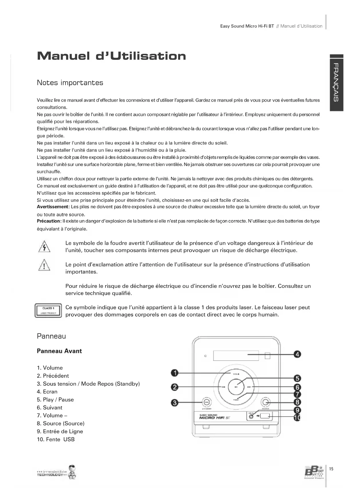 - OBSERVATION GENERALE : En aucun cas Best Buy International ou ses représentants seront responsables des dommages, y compris de ceux découlant de diminutions de bénéfices ou de tout autre préjudice financier, occasionnés par l’utilisation ou l’im- possibilité d’utilisation du produit en question, y compris dans les cas où Best Buy International aurait informé ses clients d’une telle éventualité. Comment bénéficier des avantages d’un utilisateur enregistré ? Enregistrez-vous sur notre page web http://www.bestbuy-int.com Comment demander une assistance technique ? Une fois enregistré, vous pouvez demander une assistance technique chaque fois que vous le souhaitez de la façon suivante : F R A N Ç A I S Manuel d’Utilisation // Easy Sound Micro Hi-Fi BT