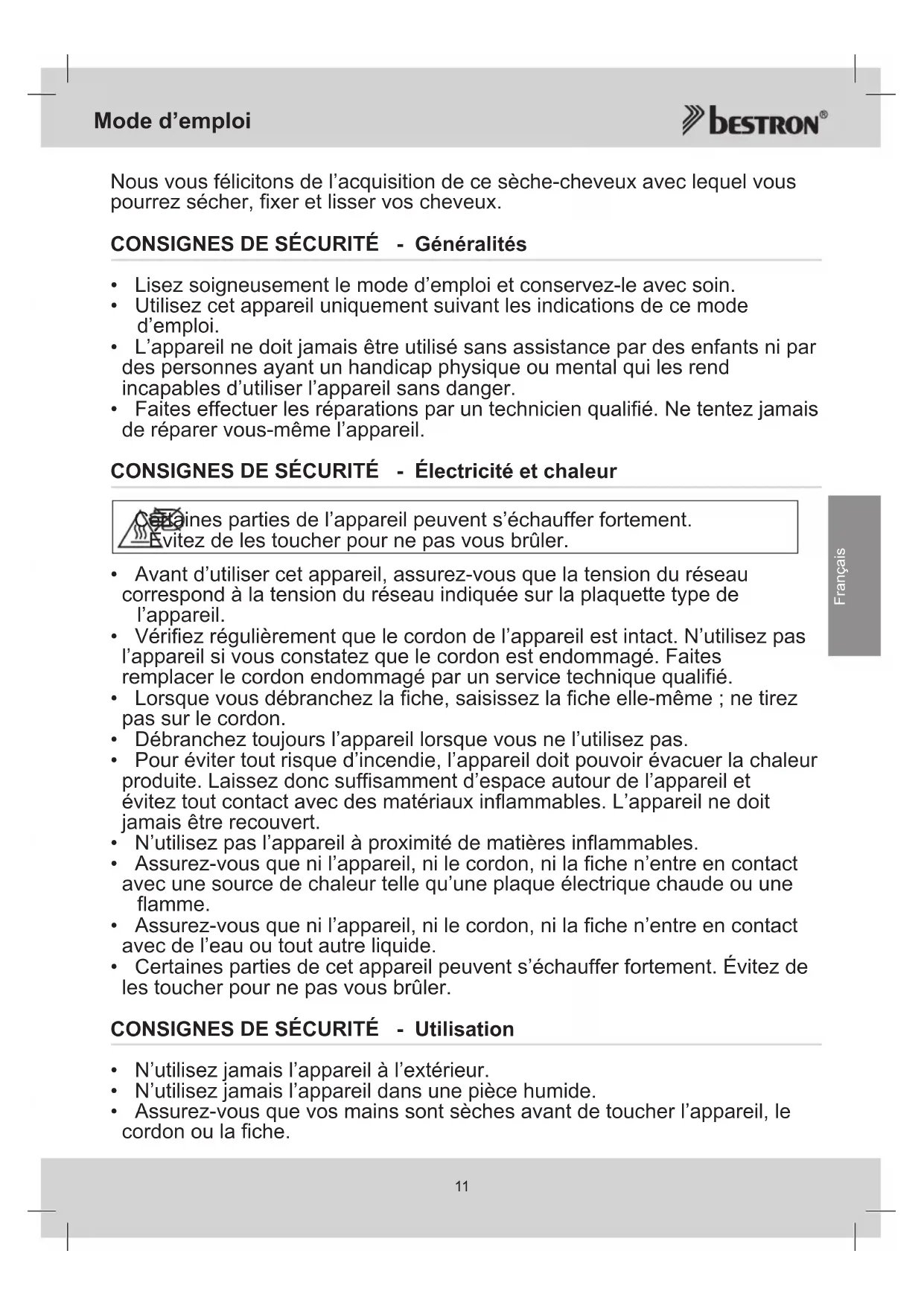Français Nous vous félicitons de l’acquisition de ce sèche-cheveux avec lequel vous pourrez sécher, fixer et lisser vos cheveux. CONSIGNES DE SÉCURITÉ - Généralités
