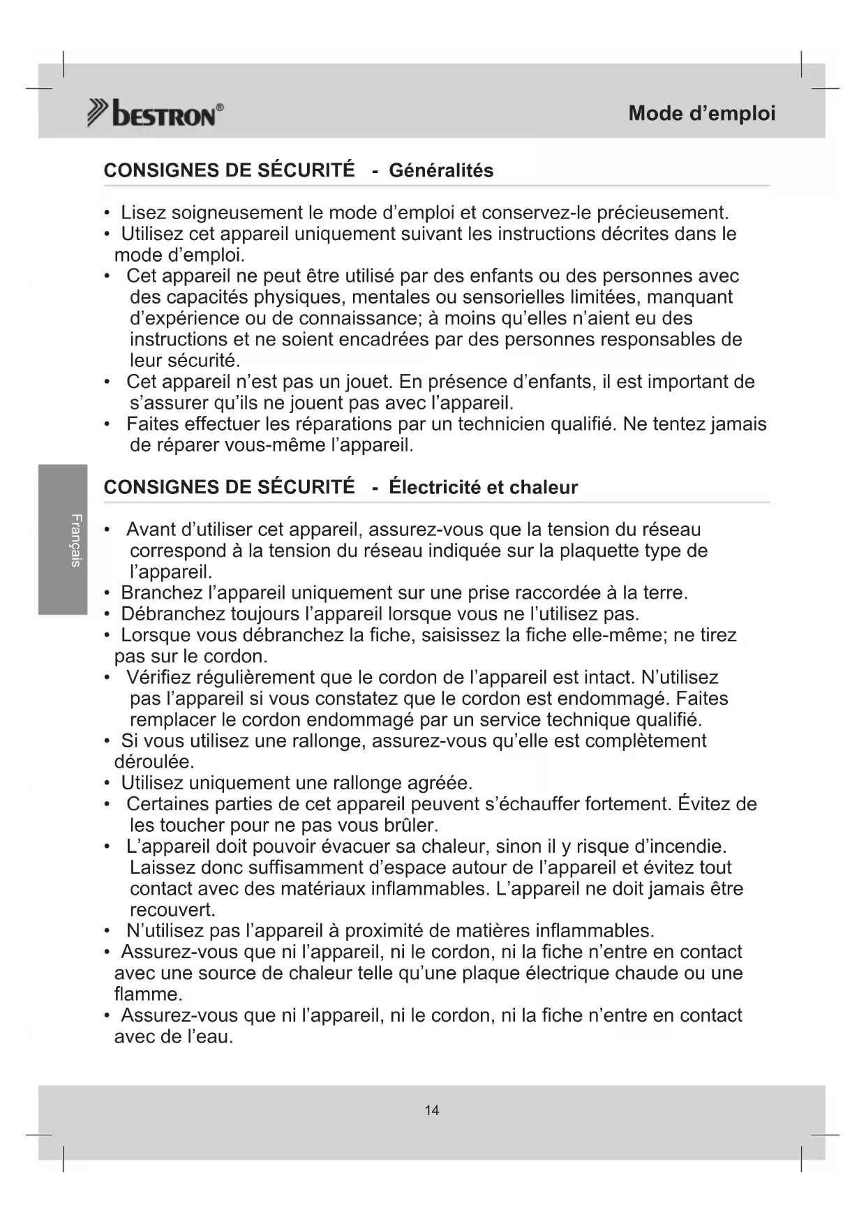 - Faites effectuer les réparations par un technicien qualifié. Ne tentez jamais de réparer vous-même l’appareil. CONSIGNES DE SÉCURITÉ - Électricité et chaleur