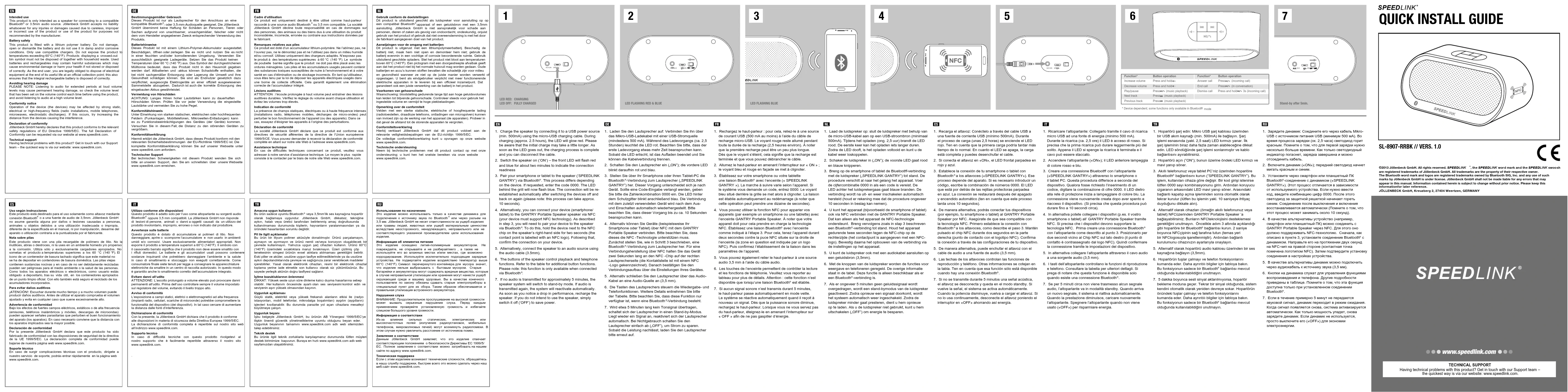 ou 3,5 mm compatible. La société Jöllenbeck GmbH décline toute responsabilité en cas de dommages sur des personnes, des animaux ou des biens dus à une utilisation du produit inconsidérée, incorrecte, erronée ou contraire aux instructions données par le fabricant. Remarques relatives aux piles Ce produit est doté d‘un accumulateur lithium-polymère. Ne l‘abîmez pas, ne l‘ouvrez pas, ne le démontez pas et ne l‘utilisez pas dans un milieu humide et/ou corrosif. Utilisez uniquement des chargeurs adaptés. N’exposez pas le produit à des températures supérieures à 60 °C (140 °F). Le symbole de poubelle barrée signie que le produit ne doit pas être placé avec les ordures ménagères. Les piles et les accumulateurs usagés peuvent contenir des substances toxiques susceptibles de nuire à l‘environnement et à votre santé en cas d‘élimination ou de stockage incorrects. En tant qu‘utilisateur, vous êtes tenu par la loi de déposer les appareils électriques usagés dans une borne de collecte ofcielle. Cela garantit également une élimination correcte de l‘accumulateur intégré. Lésions auditives ATTENTION : l‘écoute prolongée à haut volume peut entraîner des lésions auditives durables. Vériez le réglage du volume avant chaque utilisation et évitez les volumes trop élevés. Indication de conformité La présence de champs statiques, électriques ou à haute fréquence intenses (installations radio, téléphones mobiles, décharges de micro-ondes) peut perturber le bon fonctionnement de l’appareil (ou des appareils). Dans ce cas, essayez d’éloigner les appareils à l’origine des perturbations. Déclaration de conformité La société Jöllenbeck GmbH déclare que ce produit est conforme aux directives de sécurité afférentes de la directive de l‘Union européenne 1999/5/CE. Vous pouvez demander à recevoir la déclaration de conformité complète en allant sur notre site Web à l’adresse www.speedlink.com. Assistance technique En cas de difcultés techniques concernant ce produit, veuillez vous adresser à notre service d‘assistance technique. Le moyen le plus rapide consiste à le contacter par le biais de notre site Web www.speedlink.com. Gebruik conform de doelstellingen Dit product is uitsluitend geschikt als luidspreker voor aansluiting op op een compatibel Bluetooth