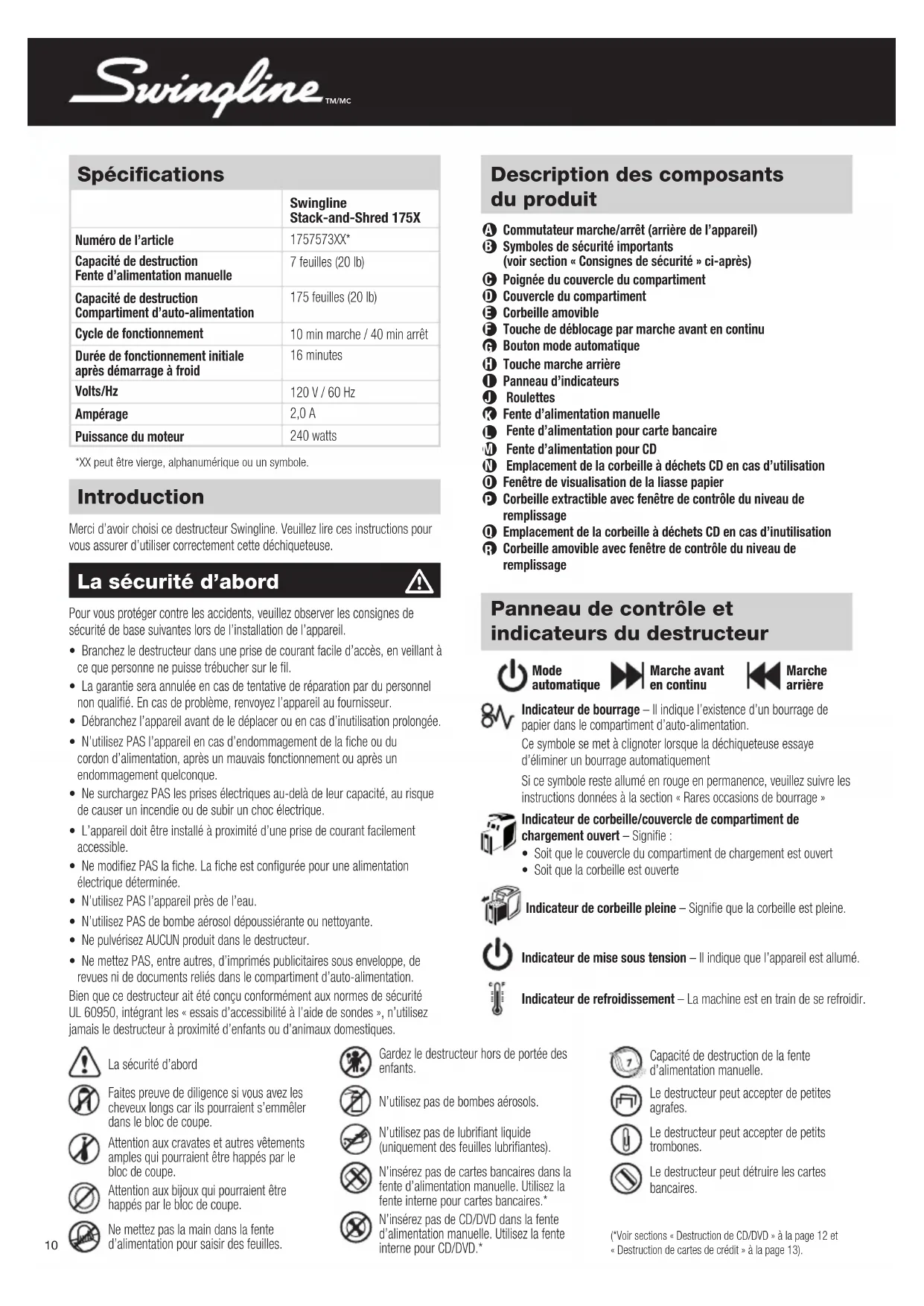 Spécifications Numéro de l’article Capacité de destruction Fente d’alimentation manuelle Capacité de destruction Compartiment d’auto-alimentation Cycle de fonctionnement Durée de fonctionnement initiale après démarrage à froid Volts/Hz Ampérage Puissance du moteur Swingline Stack-and-Shred 175X 1757573XX* 7 feuilles (20 lb) 175 feuilles (20 lb) 10 min marche / 40 min arrêt 16 minutes 120 V / 60 Hz 2,0 A 240 watts *XX peut être vierge, alphanumérique ou un symbole. Marche arrière Marche avant en continu Mode automatique Panneau de contrôle et indicateurs du destructeur Indicateur de mise sous tension – Il indique que l’appareil est allumé. Indicateur de refroidissement – La machine est en train de se refroidir. Indicateur de bourrage – Il indique l’existence d’un bourrage de papier dans le compartiment d’auto-alimentation. Ce symbole se met à clignoter lorsque la déchiqueteuse essaye d’éliminer un bourrage automatiquement Si ce symbole reste allumé en rouge en permanence, veuillez suivre les instructions données à la section « Rares occasions de bourrage » Indicateur de corbeille/couvercle de compartiment de chargement ouvert – Signie :