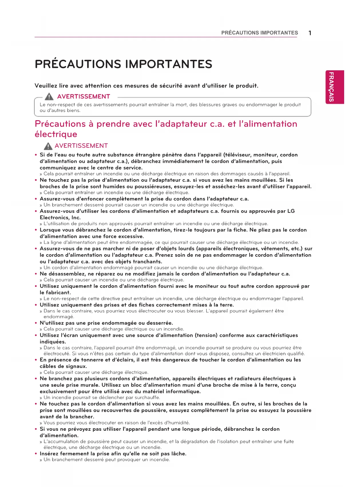 » Un branchement desserré pourrait causer un incendie ou une décharge électrique. Assurez-vous d’utiliser les cordons d’alimentation et adaptateurs c.a. fournis ou approuvés par LG Electronics, Inc.