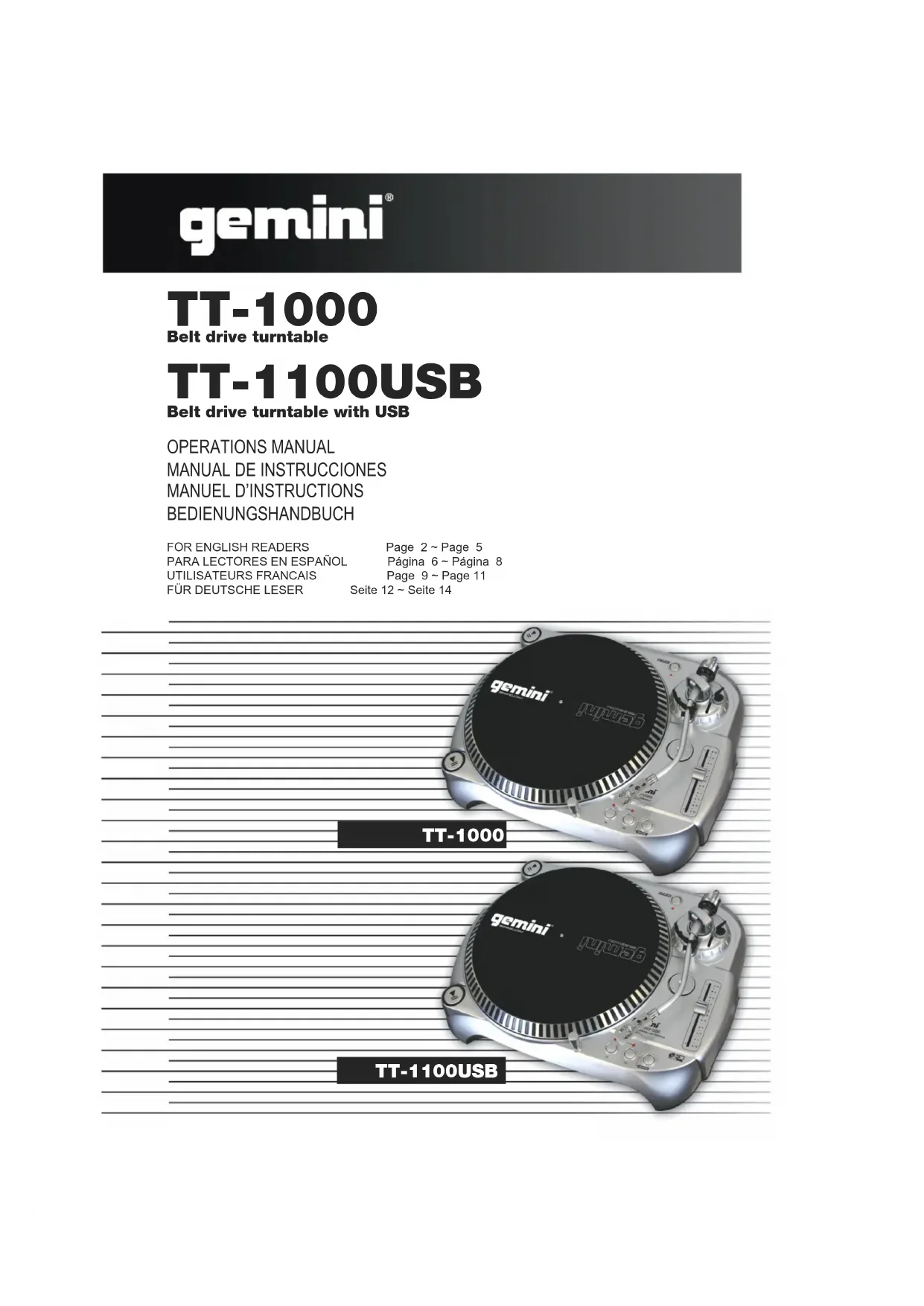 TT1100USB - Equipement DJ GEMINI - Notice d'utilisation et mode d'emploi gratuit