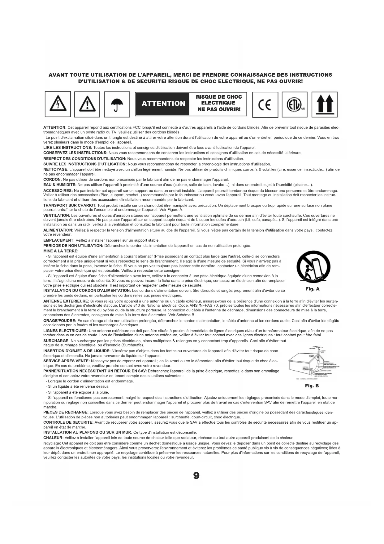 ATTENTION: Cet appareil répond aux certifications FCC lorsqu'il est connecté à d'autres appareils à l'aide de cordons blindés. Afin de prévenir tout risque de parasites élec- tromagnétiques avec un poste radio ou TV, veuillez utiliser des cordons blindés. Le point d'exclamation situé dans un triangle est destiné à attirer votre attention durant l'utilisation de votre appareil ou d'un entretien périodique de ce dernier. Vous en trou- verez plusieurs dans le mode d'emploi de l'appareil. LIRE LES INSTRUCTIONS: Toutes les instructions et consignes d'utilisation doivent être lues avant l'utilisation de l'appareil. CONSERVEZ LES INSTRUCTIONS: Nous vous recommandons de conserver les instructions et consignes d'utilisation en cas de nécessité ultérieure. RESPECT DES CONDITIONS D'UTILISATION: Nous vous recommandons de respecter les instructions d'utilisation. SUIVRE LES INSTRUCTIONS D'UTILISATION: Nous vous recommandons de respecter la chronologie des instructions d'utilisation. NETTOYAGE: L'appareil doit être nettoyé avec un chiffon légèrement humide. Ne pas utiliser de produits chimiques corrosifs & volatiles (cire, essence, insecticide…) afin de ne pas endommager l'appareil. CORDON: Ne pas utiliser de cordons non préconisés par le fabricant afin de ne pas endommager l'appareil. EAU & HUMIDITE: Ne pas utiliser l'appareil à proximité d'une source d'eau (cuisine, salle de bain, lavabo…), ni dans un endroit sujet à l'humidité (piscine…). ACCESSOIRES: Ne pas installer cet appareil sur un support ou dans un endroit instable. L'appareil pourrait tomber au risque de blesser une personne et être endommagé. Veiller à utiliser des accessoires (Pied, support, crochet..) recommandés par le fournisseur ou vendu avec l'appareil. Tout montage ou installation doit respecter les instruc- tions du fabricant et utiliser des accessoires d'installation recommandés par le fabricant. TRANSPORT SUR CHARIOT: Tout produit installé sur un chariot doit être manipulé avec précaution. Un déplacement brusque ou trop rapide sur une surface non plane pourrait entraîner la chute de l'ensemble et endommager l'appareil. Voir Figure A. VENTILATION: Les ouvertures et ouïes d'aération situées sur l'appareil permettent une ventilation optimale de ce dernier afin d'éviter toute surchauffe. Ces ouvertures ne doivent jamais être obstruées. Ne pas placer l'appareil sur un support souple risquant de bloquer les ouïes d'aération (Lit, sofa, canapé…). Si l'appareil est intégré dans une installation ou dans un rack, veillez à la ventilation et consultez le fabricant pour toute information complémentaire. ALIMENTATION: Veillez à respecter la tension d'alimentation située au dos de l'appareil. Si vous n'êtes pas certain de la tension d'utilisation dans votre pays, contactez votre revendeur. EMPLACEMENT: Veillez à installer l'appareil sur un support stable. PERIODE DE NON UTILISATION: Débranchez le cordon d'alimentation de l'appareil en cas de non utilisation prolongée. MISE A LA TERRE: - Si l'appareil est équipé d'une alimentation à courant alternatif (Prise possédant un contact plus large que l'autre), celle-ci se connectera correctement à la prise uniquement si vous respectez le sens de branchement. Il s'agit là d'une mesure de sécurité. Si vous n'arrivez pas à insérer la fiche dans la prise, inversez la fiche. Si vous ne pouvez toujours pas insérer cette dernière, contactez un électricien afin de rem- placer votre prise électrique qui est obsolète. Veillez à respecter cette consigne. - Si l'appareil est équipé d'une fiche d'alimentation avec terre, veillez à la connecter à une prise électrique équipée d'une connexion à la terre. Il s'agit d'une mesure de sécurité. Si vous ne pouvez insérer la fiche dans la prise électrique, contactez un électricien afin de remplacer votre prise électrique qui est obsolète. Il est important de respecter cette mesure de sécurité. INSTALLATION DU CORDON D'ALIMENTATION: Les cordons d'alimentation doivent être déroulés et rangés proprement afin d'éviter de se prendre les pieds dedans, en particulier les cordons reliés aux prises électriques. ANTENNE EXTERIEURE: Si vous reliez votre appareil à une antenne ou un câble extérieur, assurez-vous de la présence d'une connexion à la terre afin d'éviter les surten- sions et les décharges d'électricité statique. L'article 810 du National Electrical Code, ANSI/NFPAS 70, précise toutes les informations nécessaires afin d'effectuer correcte- ment le branchement à la terre du pylône ou de la structure porteuse, la connexion du câble à l'antenne de décharge, dimensions des connecteurs de mise à la terre, connexions des électrodes, consignes de mise à la terre des électrodes. Voir Schéma B. ORAGE/FOUDRE: En cas d'orage et de non utilisation prolongée, débranchez le cordon d'alimentation, le câble d'antenne et les cordons audio. Ceci afin d'éviter les dégâts occasionnés par la foudre et les surcharges électriques. LIGNES ELECTRIQUES: Une antenne extérieure ne doit pas être située à proximité immédiate de lignes électriques et/ou d'un transformateur électrique, afin de ne pas tomber dessus en cas de chute. Lors de l'installation d'une antenne extérieure, veillez à éviter tout contact avec des lignes électriques : tout contact peut être fatal. SURCHARGE: Ne surchargez pas les prises électriques, blocs multiprises & rallonges en y connectant trop d'appareils. Ceci afin d'éviter tout risque de surcharge électrique ou d'incendie (Surchauffe). INSERTION D'OBJET & DE LIQUIDE: N'insérez pas d'objets dans les fentes ou ouvertures de l'appareil afin d'éviter tout risque de choc électrique et d'incendie. Ne jamais renverser de liquide sur l'appareil. SERVICE APRES VENTE: N'essayez pas de réparer cet appareil ; en l'ouvrant ou en le démontant afin d'éviter tout risque de choc élec- trique. En cas de problème, veuillez prendre contact a