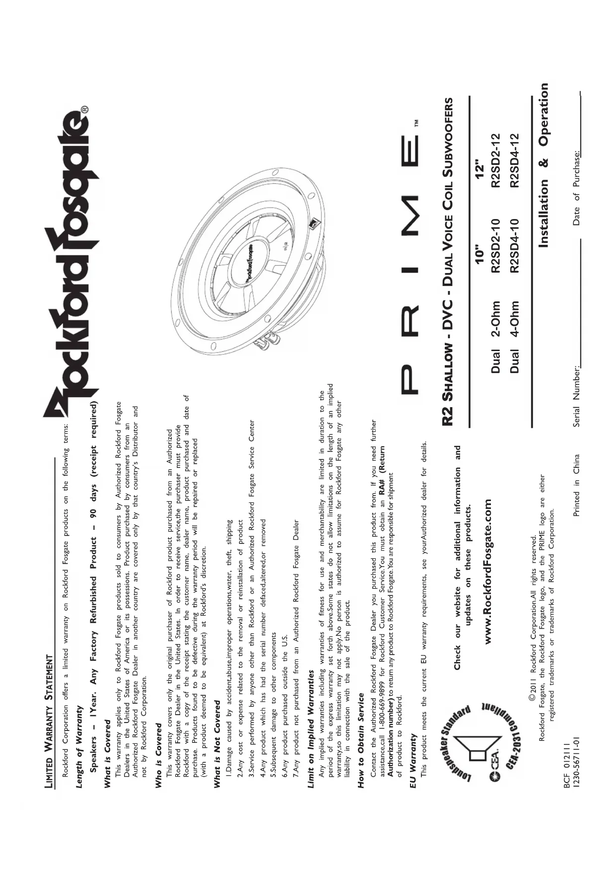 R2SD2-10 / R2SD4-10 R2SD2-12 / R2SD4-12 Nominal Impedance (ohms) 2 x 2 / 2 x 4 2 x 2 / 2 x 4 Frequency Response (Hz) 45-250 43-250 Voice Coil Diameter - inch 2 (4-Layer) 2 (4-Layer) (mm) (51) (51) Displacement - cu. ft. 0.037 0.039 (Liter) (1.05) (1.10) Fs - Free Air Resonance (Hz) 33 30 Qts 0.69 / 0.73 0.82 / 0.87 Vas - cu. ft. 0.98 / 1.02 1.44 / 1.50 (Liter) (27.7 / 29.0) (40.9 / 42.5) Xmax - inch 0.315 0.394 (mm) (8) (10) SPL (dB @ 1w/1m) 82 81 Power Handling-Watts (RMS) 200 250 (Peak) 400 500 SPECIFICATIONS WIRING CONFIGURATIONS By varying the wiring configuration of your speakers you can create an impedance load to match your system.Altering the wiring configurations gives a range of options for impedance loads. Series, Parallel, or Series-Parallel wiring configurations are different techniques for wiring speakers that provide different loads. Series configuration is a string method where speakers are wired end to end. Parallel configuration uses two or more speakers wired across common terminals. Series-Parallel configuration combines both techniques. Choose the wiring diagram that corresponds to the number of woofers and the impedance of your amplifier. SUBWOOFER CROSSOVERS There are two operational types of crossovers, passive and active. Passive crossovers (coils or inductors) are placed on the speaker leads between the amplifier and speaker.An active crossover is an electronic filter that separates the audio signal fed to different amplifiers. For optimum subwoofer performance, we recommend using an active 80-100Hz low-pass crossover at 12dB/octave.Français MISE EN GARDE : avant d'entamer l'installation,déconnectez la broche négative (-) de la batterie pour éviter tout risque de blessures, d’incendie ou de dommages à l'appareil. Enceintes recommandées Ce manuel décrit deux types particuliers d'enceintes aux performances tout à fait distinctes. Cette section vous permettra de décider celui qui vous conviendra le mieux. Enceintes Étanches Les enceintes étanches sont les plus faciles à fabriquer. À cet égard, la chose la plus importante dans leur fabrication est de vous assurer qu'elles sont vraiment hermétiques.Appliquez de la colle et un produit d'étanchéité sur tous les joints pour solidifier l'ensemble et empêcher toute fuite d'air. Le volume du caisson influe directement sur la performance du haut-parleur. Les enceintes de plus grande dimension délivrent une réponse uniforme en fréquence avec des graves profonds alors que les enceintes plus petites ont une courbe de réponse plus prononcée et un rendement généralement supérieur pour un niveau de pression acoustique plus élevé. Avantage des enceintes étanches :