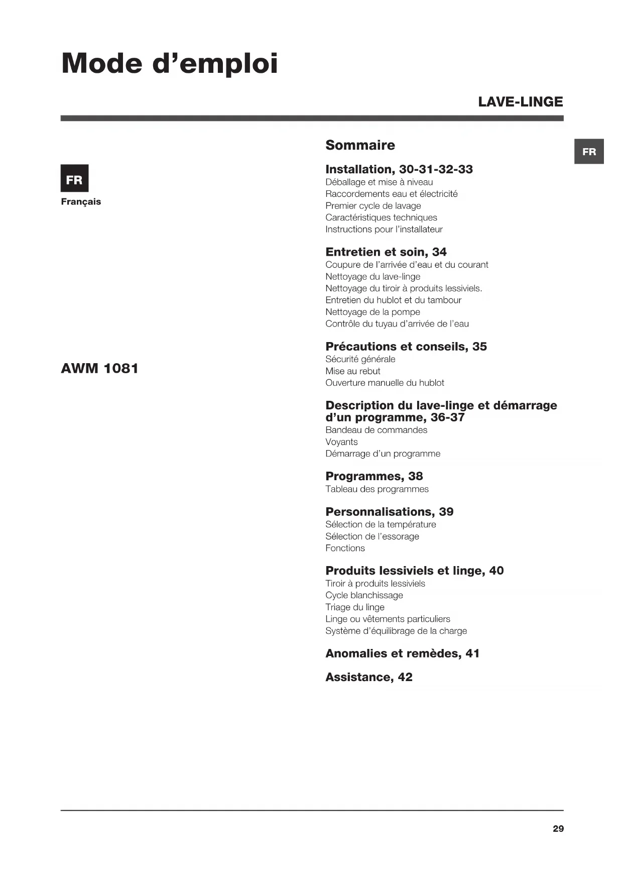 Français Sommaire Installation, 30-31-32-33 Déballage et mise à niveau Raccordements eau et électricité Premier cycle de lavage Caractéristiques techniques Instructions pour l’installateur Entretien et soin, 34 Coupure de l’arrivée d’eau et du courant Nettoyage du lave-linge Nettoyage du tiroir à produits lessiviels. Entretien du hublot et du tambour Nettoyage de la pompe Contrôle du tuyau d’arrivée de l’eau Précautions et conseils, 35 Sécurité générale Mise au rebut Ouverture manuelle du hublot Description du lave-linge et démarrage d’un programme, 36-37 Bandeau de commandes Voyants Démarrage d’un programme Programmes, 38 Tableau des programmes Personnalisations, 39 Sélection de la température Sélection de l’essorage Fonctions Produits lessiviels et linge, 40 Tiroir à produits lessiviels Cycle blanchissage Triage du linge Linge ou vêtements particuliers Système d’équilibrage de la charge Anomalies et remèdes, 41 Assistance, 42