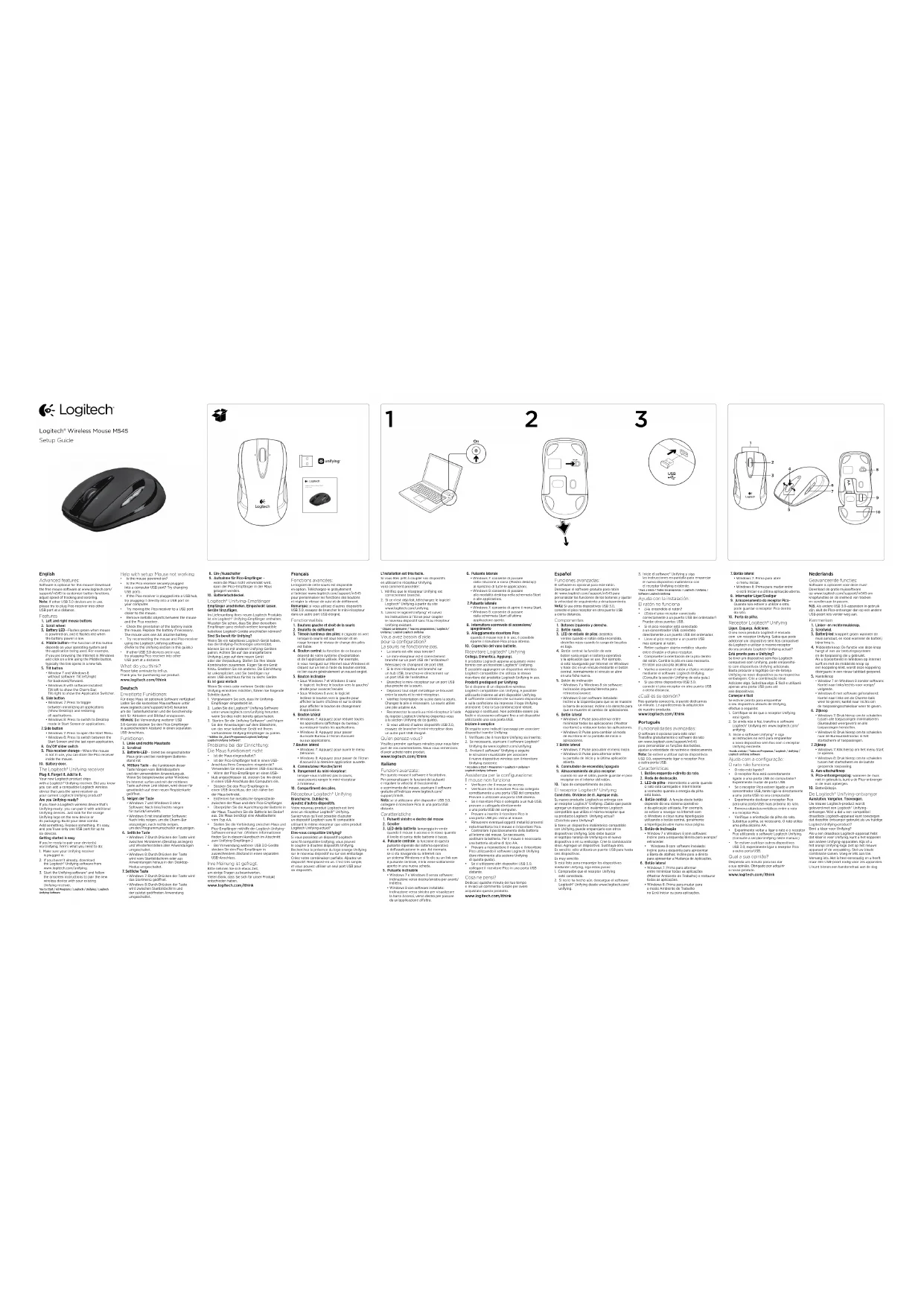 • La souris est-elle sous tension?• Le mini-récepteur est-il correctement branché sur un port USB de l’ordinateur? Réessayez en changeant de port USB.• Si le mini-récepteur est branché sur un hub USB, branchez-le directement sur un port USB de l’ordinateur.• Branchez le mini-récepteur sur un port USB plus proche de la souris.• Déplacez tout objet métallique se trouvant entre la souris et le mini-récepteur.• Vérifiez l’orientation de la pile dans la souris. Changez la pile si nécessaire. La souris utilise une pile alcaline AA.• Reconnectez la souris au mini-récepteur à l’aide du logiciel Logitech Unifying (reportez-vous à la section Unifying de ce guide).• Si vous utilisez d’autres dispositifs USB 3.0, essayez de brancher le mini-récepteur dans un autre port USB éloigné. Qu’en pensez-vous? Veuillez prendre quelques minutes pour nous faire part de vos commentaires. Nous vous remercions d’avoir acheté notre produit.www.logitech.com/ithink Italiano