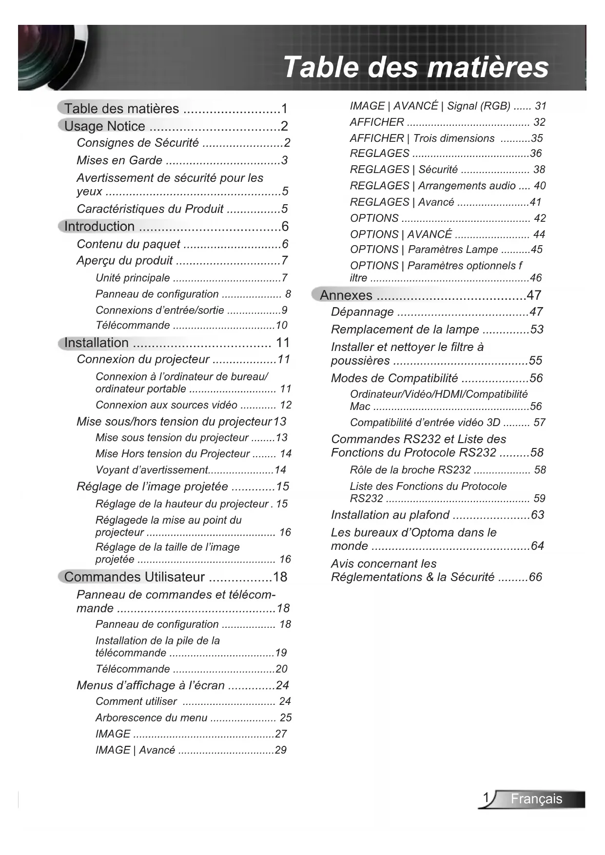 projecteur près d’une source chaude. Objectif Unité : mm64 Français Annexes Les bureaux d’Optoma dans le monde Pour une réparation ou un support, veuillez contacter votre bureau régional. ETATS-UNIS 3178 Laurelview Ct. 888-289-6786Fremont, CA 94538, USA 510-897-8601www.optomausa.com services@optoma.com Canada 3178 Laurelview Ct. 888-289-6786Fremont, CA 94538, USA 510-897-8601www.optomausa.com services@optoma.com Amérique Latine 3178 Laurelview Ct. 888-289-6786Fremont, CA 94538, USA 510-897-8601www.optomausa.com services@optoma.com Europe 42 Caxton Way, The Watford Business Park Watford, Hertfordshire, WD18 8QZ, UK +44 (0) 1923 691 800www.optoma.eu +44 (0) 1923 691 888Téléphone réparations : service@tsc-europe.com +44 (0)1923 691865 Benelux BV Randstad 22-123 +31 (0) 36 820 02531316 BW Almere +31 (0) 36 548 9052The Netherlands www.optoma.nl France Bâtiment E +33 1 41 46 12 20 81-83 avenue Edouard Vaillant +33 1 41 46 94 3592100 Boulogne Billancourt, France savoptoma@optoma.fr Espagne C/ José Hierro,36 Of. 1C +34 91 499 06 06 28522 Rivas VaciaMadrid, +34 91 670 08 32Espagne65 Français Annexes Allemagne Wiesenstrasse 21 W +49 (0) 211 506 6670 D40549 Düsseldorf, +49 (0) 211 506 66799 Allemagne info@optoma.de Scandinavie Lerpeveien 25 +47 32 98 89 90 3040 Drammen +47 32 98 89 99 Norvège info@optoma.no PO.BOX 9515 3038 Drammen Norvège Corée WOOMI TECH.CO.,LTD. 4F,Minu Bldg.33-14, Kangnam-Ku, +82+2+34430004 seoul,135-815, CORÉE +82+2+34430005 Japon 東京都足立区綾瀬3-25-18 株式会社オーエス info@os-worldwide.com コンタクトセンター:0120-380-495 www.os-worldwide.com Taiwan 231台灣新北市 +886-2-8911-8600 新店區 +886-2-8911-6550 北新路三段215號12F services@optoma.com.tw www.optoma.com.tw asia.optoma.com Hong Kong Unit A, 27/F Dragon Centre, 79 Wing Hong Street, +852-2396-8968 Cheung Sha Wan, +852-2370-1222 Kowloon, Hong Kong www.optoma.com.hk Chine 5F, No. 1205, Kaixuan Rd., +86-21-62947376 Changning District +86-21-62947375 Shanghai, 200052, Chine www.optoma.com.cn66 Français Annexes Avis concernant les Réglementations & la Sécurité Cet appendice liste les instructions générales concernant votre projecteur. Avis FCC Cet appareil a été testé et reconnu conforme aux limites pour les appareils numériques de Classe B, conformément à l’Article 15 des Règlements FCC. Ces limites garantissent une protection sufsante contre les interférences dangereuses liées à l’utilisation de l’équipement dans un environnement résidentiel. Cet appareil génère, utilise et peut émettre de l’énergie fréquence radio et, s’il n’est pas installé et utilisé en accord avec les instructions, peut provoquer des interférences dans les communications radio. Cependant, il ne peut être garanti qu’aucune interférence ne se produira dans une installation particulière. Si cet appareil provoque des interférences néfastes pour la réception de la radio ou de la télévision, ce qui peut être déterminé en éteignant puis en rallumant l’appareil, l’utilisateur est encouragé à tenter de corriger les interférences par une ou plusieurs des mesures suivantes :