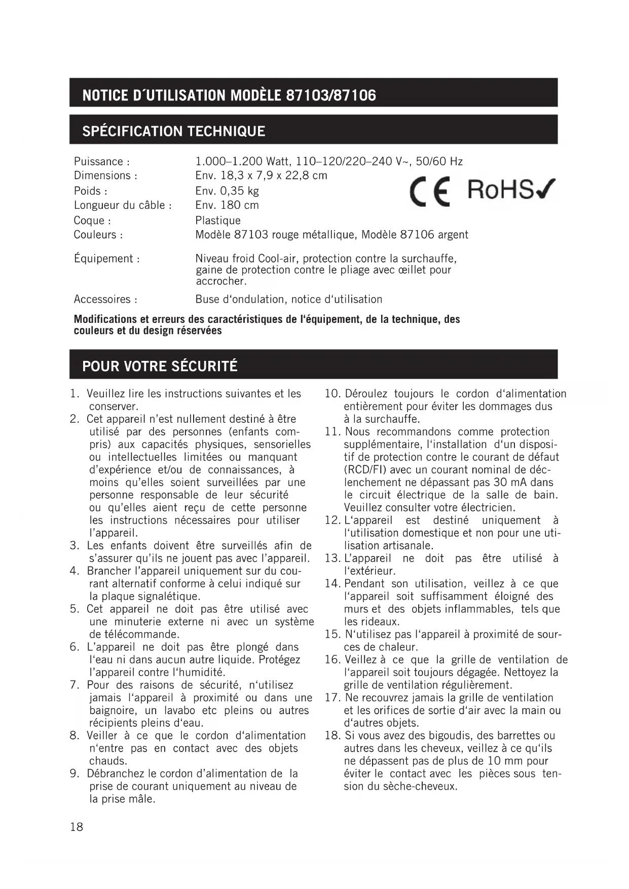 autres dans les cheveux, veillez à ce qu‘ils ne dépassent pas de plus de 10 mm pour éviter le contact avec les pièces sous ten- sion du sèche-cheveux. Puissance : 1.000–1.200 Watt, 110–120/220–240 V~, 50/60 Hz Dimensions : Env. 18,3 x 7,9 x 22,8 cm Poids : Env. 0,35 kg Longueur du câble : Env. 180 cm Coque : Plastique Couleurs : Modèle 87103 rouge métallique, Modèle 87106 argent Équipement : Niveau froid Cool-air, protection contre la surchauffe, gaine de protection contre le pliage avec œillet pour accrocher. Accessoires : Buse d‘ondulation, notice d‘utilisation Modifications et erreurs des caractéristiques de l‘équipement, de la technique, des couleurs et du design réservées19