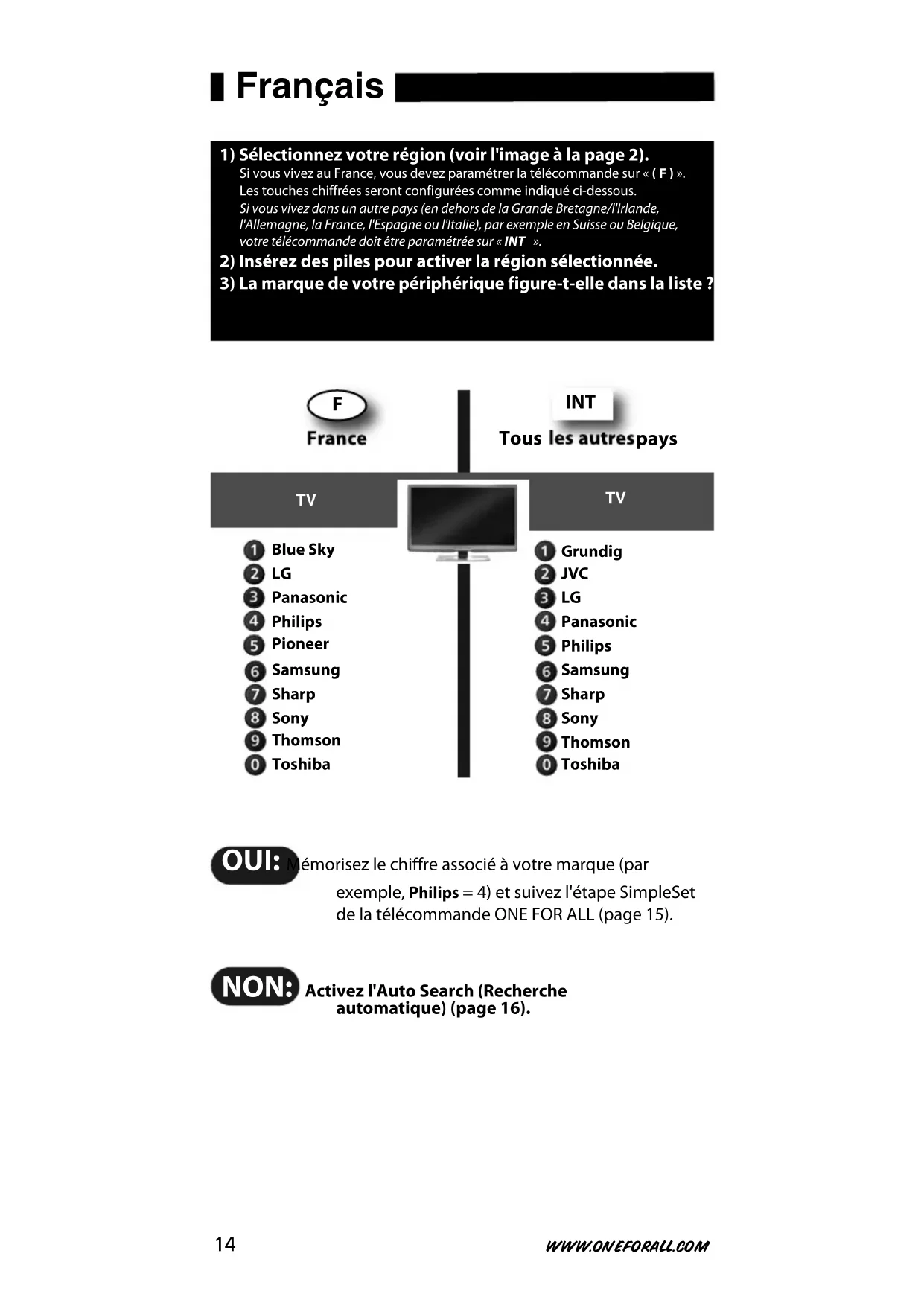 ONE FOR ALL SimpleSet Ce mode vous permet de configurer les marques d'appareils les plus répan-dus en quelques minutes. Localisez simplement la touche chiffrée associéeà votre marque (page 14) et suivez les étapes A à B.