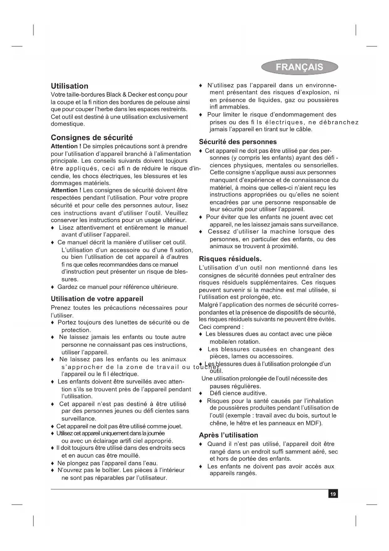 Votre taille-bordures Black & Decker est conçu pour la coupe et la fi nition des cordures de pelouse ainsi que pour couper l'herbe dans les espaces restreints. Cet outil est destiné à une utilisation exclusivement domestique.