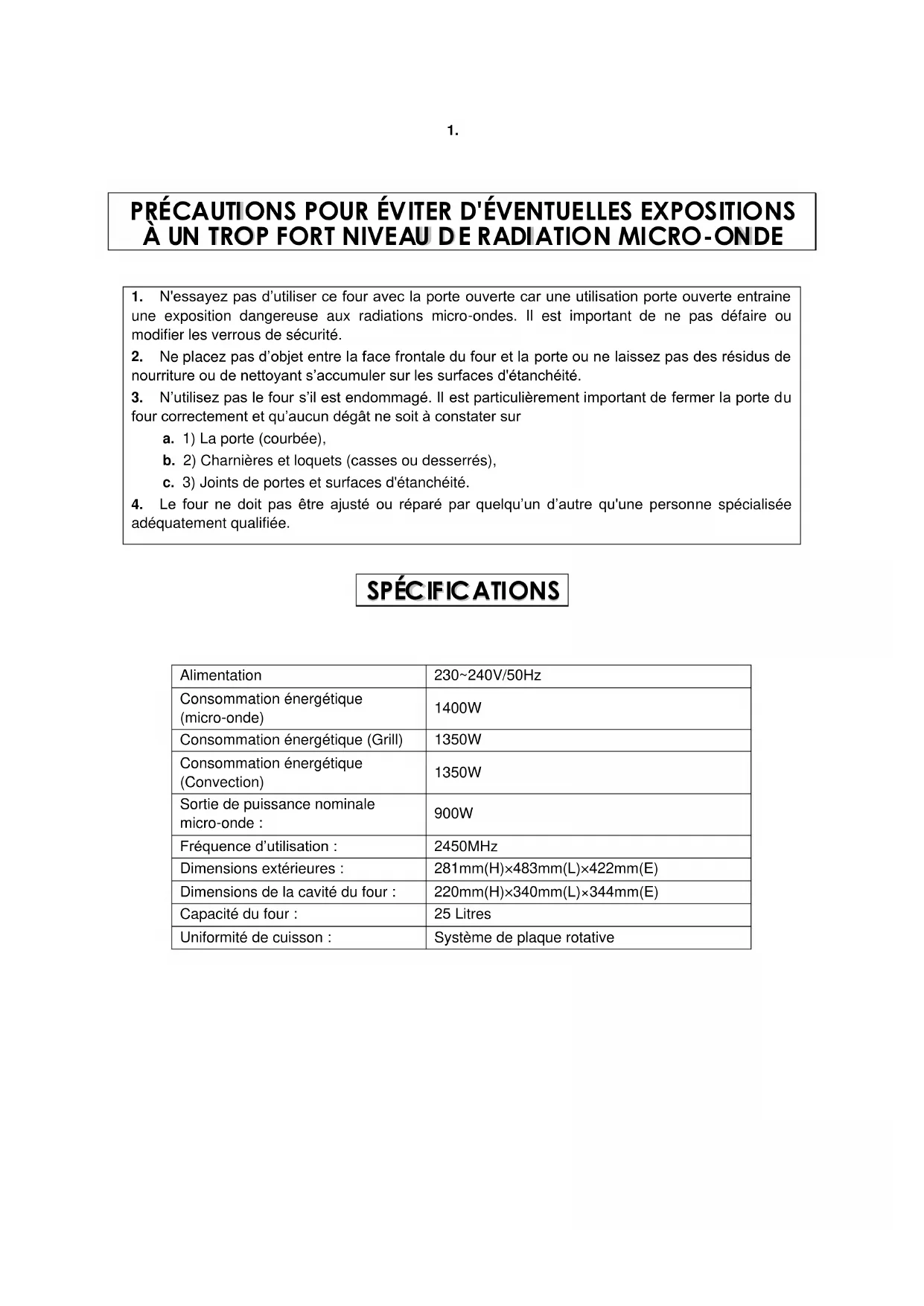 Alimentation 230~240V/50Hz Consommation énergétique (micro-onde) 1400W Consommation énergétique (Grill) 1350W Consommation énergétique (Convection) 1350W Sortie de puissance nominale micro-onde : 900W Fréquence d’utilisation : 2450MHz Dimensions extérieures : 281mm(H)×483mm(L)×422mm(E) Dimensions de la cavité du four : 220mm(H)×340mm(L)×344mm(E) Capacité du four : 25 Litres Uniformité de cuisson : Système de plaque rotative