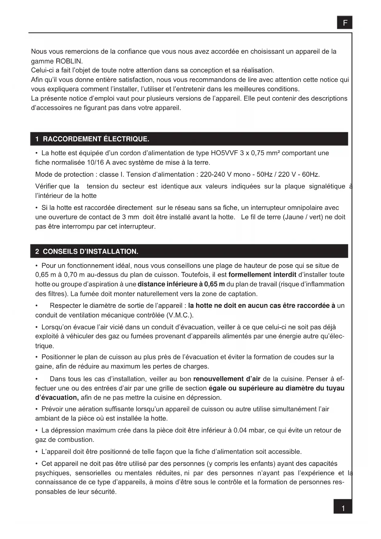 6043102 - Hotte ROBLIN - Notice d'utilisation et mode d'emploi gratuit