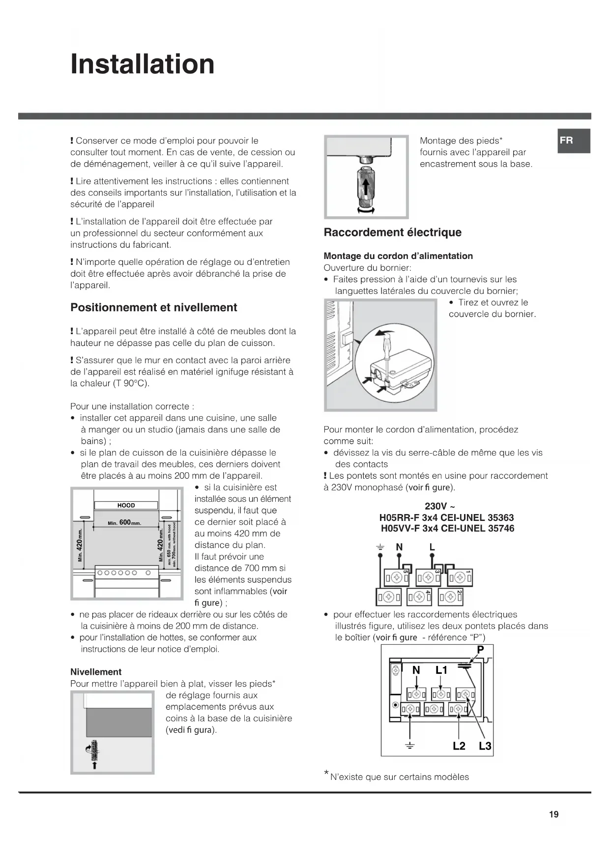 ! Conserver ce mode d’emploi pour pouvoir le consulter tout moment. En cas de vente, de cession ou de déménagement, veiller à ce qu’il suive l’appareil.! Lire attentivement les instructions : elles contiennent des conseils importants sur l’installation, l’utilisation et la sécurité de l’appareil! L’installation de l’appareil doit être effectuée par un professionnel du secteur conformément aux instructions du fabricant. ! N’importe quelle opération de réglage ou d’entretien doit être effectuée après avoir débranché la prise de l’appareil. Positionnement et nivellement ! L’appareil peut être installé à côté de meubles dont la hauteur ne dépasse pas celle du plan de cuisson.! S’assurer que le mur en contact avec la paroi arrière de l’appareil est réalisé en matériel ignifuge résistant à la chaleur (T 90°C).Pour une installation correcte : • installer cet appareil dans une cuisine, une salle à manger ou un studio (jamais dans une salle de bains) ;• si le plan de cuisson de la cuisinière dépasse le plan de travail des meubles, ces derniers doivent être placés à au moins 200 mm de l’appareil.• si la cuisinière est installée sous un élément suspendu, il faut que ce dernier soit placé à au moins 420 mm de distance du plan. Il faut prévoir une distance de 700 mm si les éléments suspendus sont inflammables (voir gure) ;• ne pas placer de rideaux derrière ou sur les côtés de la cuisinière à moins de 200 mm de distance.• pour l’installation de hottes, se conformer aux instructions de leur notice d’emploi. NivellementPour mettre l’appareil bien à plat, visser les pieds* de réglage fournis aux emplacements prévus aux coins à la base de la cuisinière (vedi gura).Montage des pieds* fournis avec l’appareil par encastrement sous la base. Raccordement électrique Montage du cordon d’alimentationOuverture du bornier: • Faites pression à l’aide d’un tournevis sur les languettes latérales du couvercle du bornier;• Tirez et ouvrez le couvercle du bornier.Pour monter le cordon d’alimentation, procédez comme suit:• dévissez la vis du serre-câble de même que les vis des contacts! Les pontets sont montés en usine pour raccordement à 230V monophasé (voir gure).