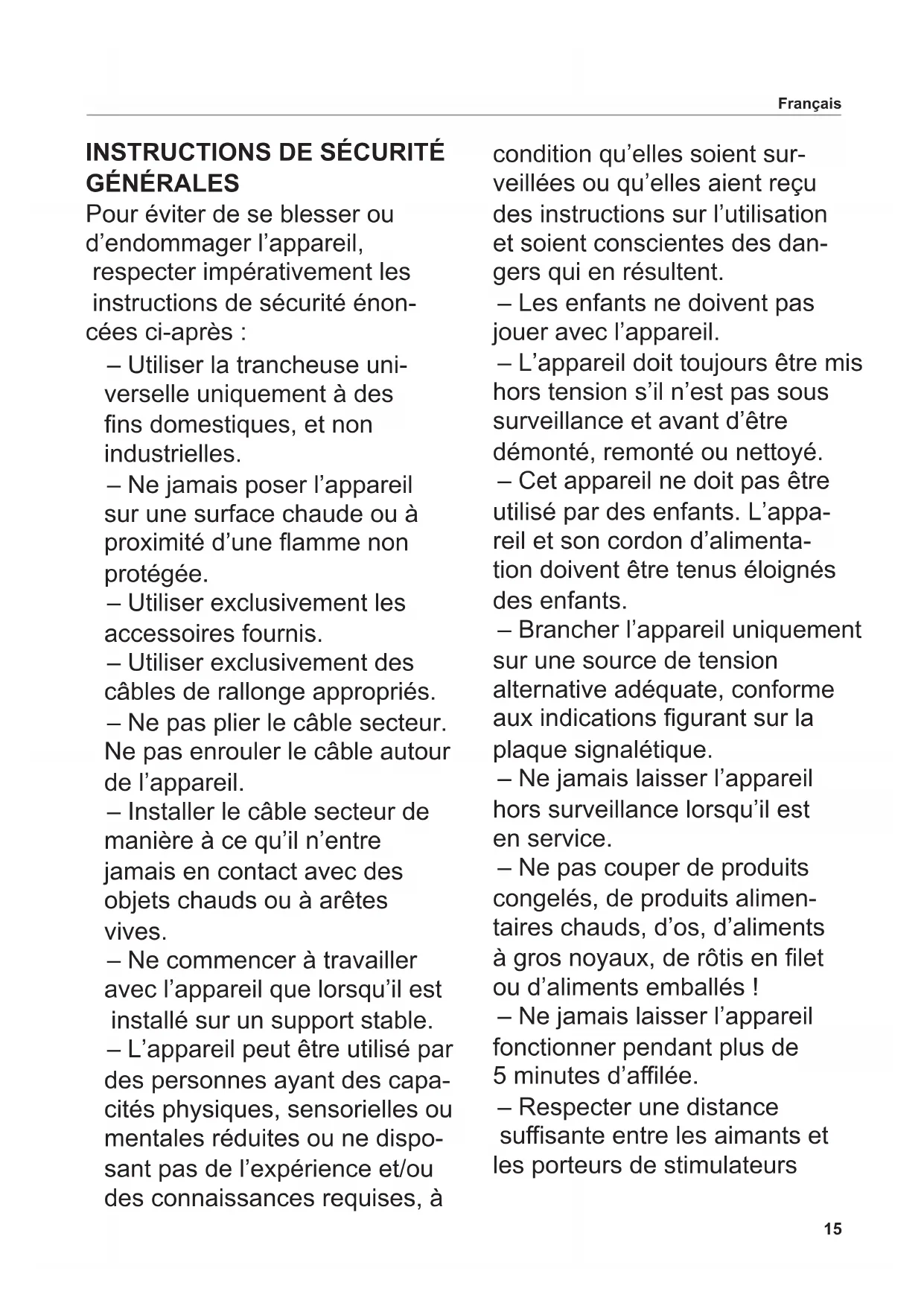 Pour éviter de se blesser ou d’endommager l’appareil, respecter impérativement les instructions de sécurité énon- cées ci-après : – Utiliser la trancheuse uni- verselle uniquement à des ns domestiques, et non industrielles. – Ne jamais poser l’appareil sur une surface chaude ou à proximité d’une amme non protégée. – Utiliser exclusivement les accessoires fournis. – Utiliser exclusivement des câbles de rallonge appropriés. – Ne pas plier le câble secteur. Ne pas enrouler le câble autour de l’appareil. – Installer le câble secteur de manière à ce qu’il n’entre jamais en contact avec des objets chauds ou à arêtes vives. – Ne commencer à travailler avec l’appareil que lorsqu’il est installé sur un support stable. – L’appareil peut être utilisé par des personnes ayant des capa- cités physiques, sensorielles ou mentales réduites ou ne dispo- sant pas de l’expérience et/ou des connaissances requises, à condition qu’elles soient sur- veillées ou qu’elles aient reçu des instructions sur l’utilisation et soient conscientes des dan- gers qui en résultent. – Les enfants ne doivent pas jouer avec l’appareil. – L’appareil doit toujours être mis hors tension s’il n’est pas sous surveillance et avant d’être démonté, remonté ou nettoyé. – Cet appareil ne doit pas être utilisé par des enfants. L’appa- reil et son cordon d’alimenta- tion doivent être tenus éloignés des enfants. – Brancher l’appareil uniquement sur une source de tension alternative adéquate, conforme aux indications gurant sur la plaque signalétique. – Ne jamais laisser l’appareil hors surveillance lorsqu’il est en service. – Ne pas couper de produits congelés, de produits alimen- taires chauds, d’os, d’aliments à gros noyaux, de rôtis en let ou d’aliments emballés ! – Ne jamais laisser l’appareil fonctionner pendant plus de 5 minutes d’alée. – Respecter une distance susante entre les aimants et les porteurs de stimulateurs16 cardiaques et de débrillateurs implantés. – Tenir éloignés les supports de données magnétiques (cartes de crédit, cartes mémoire, etc.) et les appareils électro- niques (téléphones portables, ordinateurs, moniteurs, etc.) des champs magnétiques importants. Risque de décharge électrique – Débrancher toujours la che secteur de la prise de courant en cas de panne, avant de net- toyer l’appareil ou lorsqu’il n’est pas utilisé. Tirer sur la che et non sur le câble. – Ne jamais plonger l’appareil dans l’eau. Ne pas expo- ser l’appareil à la pluie ou à d’autres sources d’humidité. Si l’appareil devait toutefois tomber dans l’eau, débran- cher d’abord la che sec- teur de la prise de courant, puis sortir l’appareil de l’eau. Faire ensuite vérier l’appa- reil dans un centre de service après-vente agréé avant de le remettre en marche. – Ne jamais utiliser l’appareil avec des mains humides. Ne pas l’employer lorsqu’il est humide ou mouillé, ou si vous vous trouvez sur un sol humide. Ne pas utiliser l’appa- reil en plein air. – Cesser aussitôt d’utiliser l’appareil si certains de ses éléments sont endommagés et contacter le service après- vente ritter. – Si le câble secteur est endom- magé, il doit être remplacé par le fabricant, son service après- vente ou une personne dispo- sant de la qualication requise, an d’exclure tout risque. Risques de blessures – Ne pas utiliser cet appareil sans chariot ou pousse-restes, à moins que la taille et la forme du produit à trancher ne le per- mettent pas. – Mettre l’appareil hors tension et le débrancher avant de remplacer des accessoires ou des pièces mobiles en cours de fonctionnement. – La lame est très coupante. – En cours de fonctionnement, ne jamais toucher la lame ! – Avant de nettoyer l’appareil, le mettre hors tension, débran- cher la che secteur de la prise de courant et placer le bouton de réglage de l’épaisseur de coupe en position « 0 ». – La lame continue de tourner quelques instants après la mise hors tension. Français17 Français Déplier les graphiques qui se trouvent dans la partie avant et arrière au dos du manuel. Lire attentivement le mode d’emploi avant la mise en service de l’appareil. Conserver le mode d’emploi et le laisser avec l’appa- reil lorsque celui-ci est vendu. La dernière version du mode d’emploi est également dispo- nible sous www.ritterwerk.de. USAGE CONFORME La trancheuse universelle permet de couper les produits alimen- taires à usage domestique. La trancheuse universelle est conçue pour le contact avec les denrées alimentaires. Une utilisation non conforme ou inadaptée peut être à l’origine de graves blessures ou endom- mager l’appareil. Les clauses de garantie et la responsabilité du fabricant n’ont plus cours de validité dans ce cas.