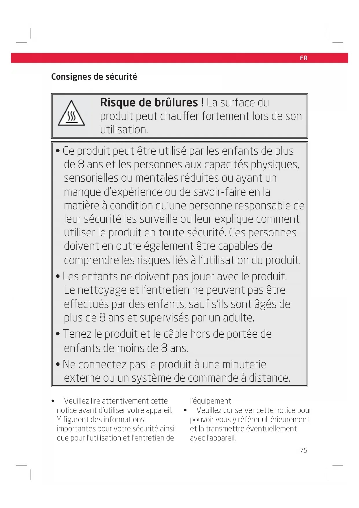 Risque de brûlures ! La surface du produit peut chauer fortement lors de son utilisation.