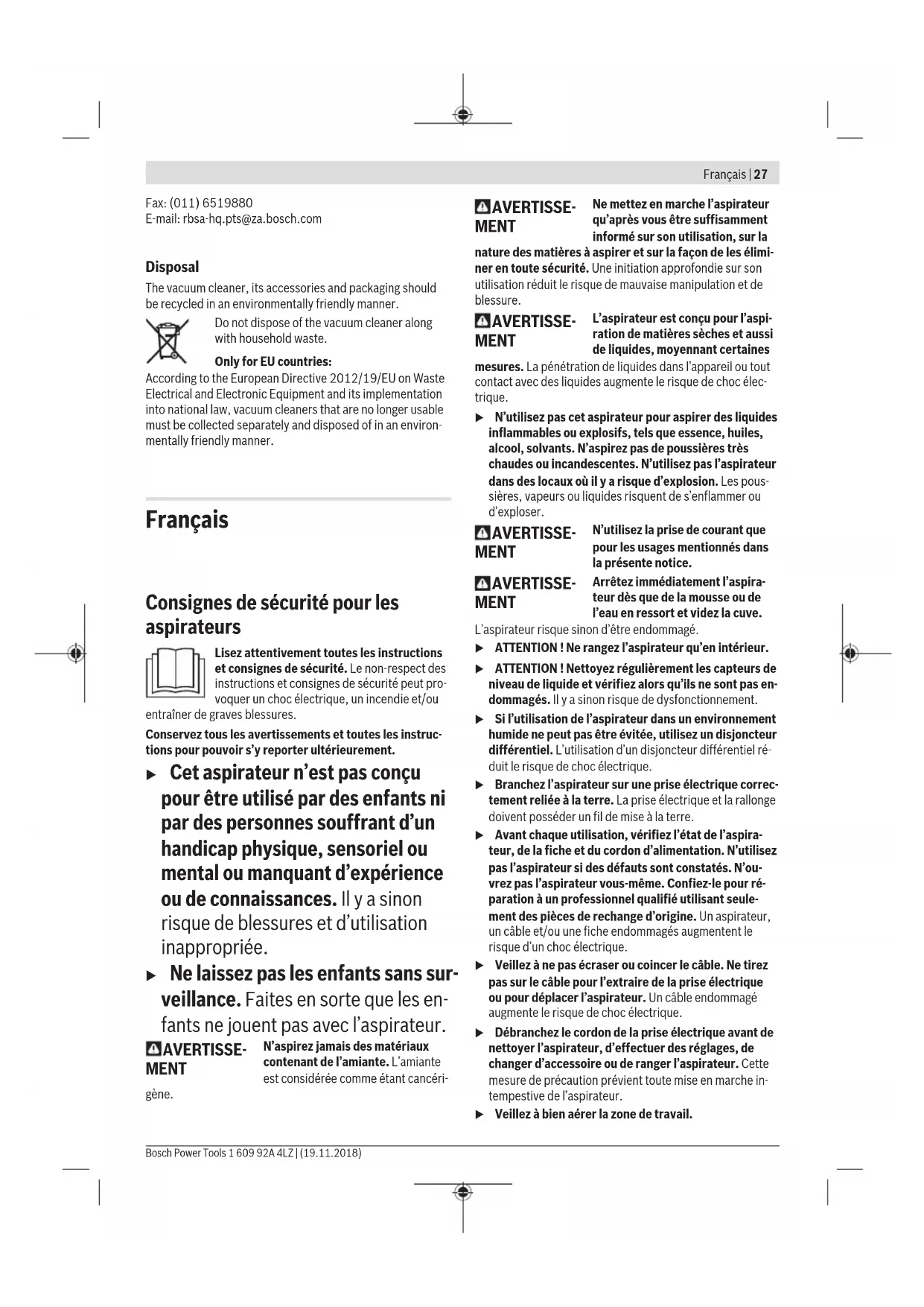 tempestive de l’aspirateur. u Veillez à bien aérer la zone de travail. Français | 27 Bosch Power Tools 1 609 92A 4LZ | (19.11.2018)28 | Français