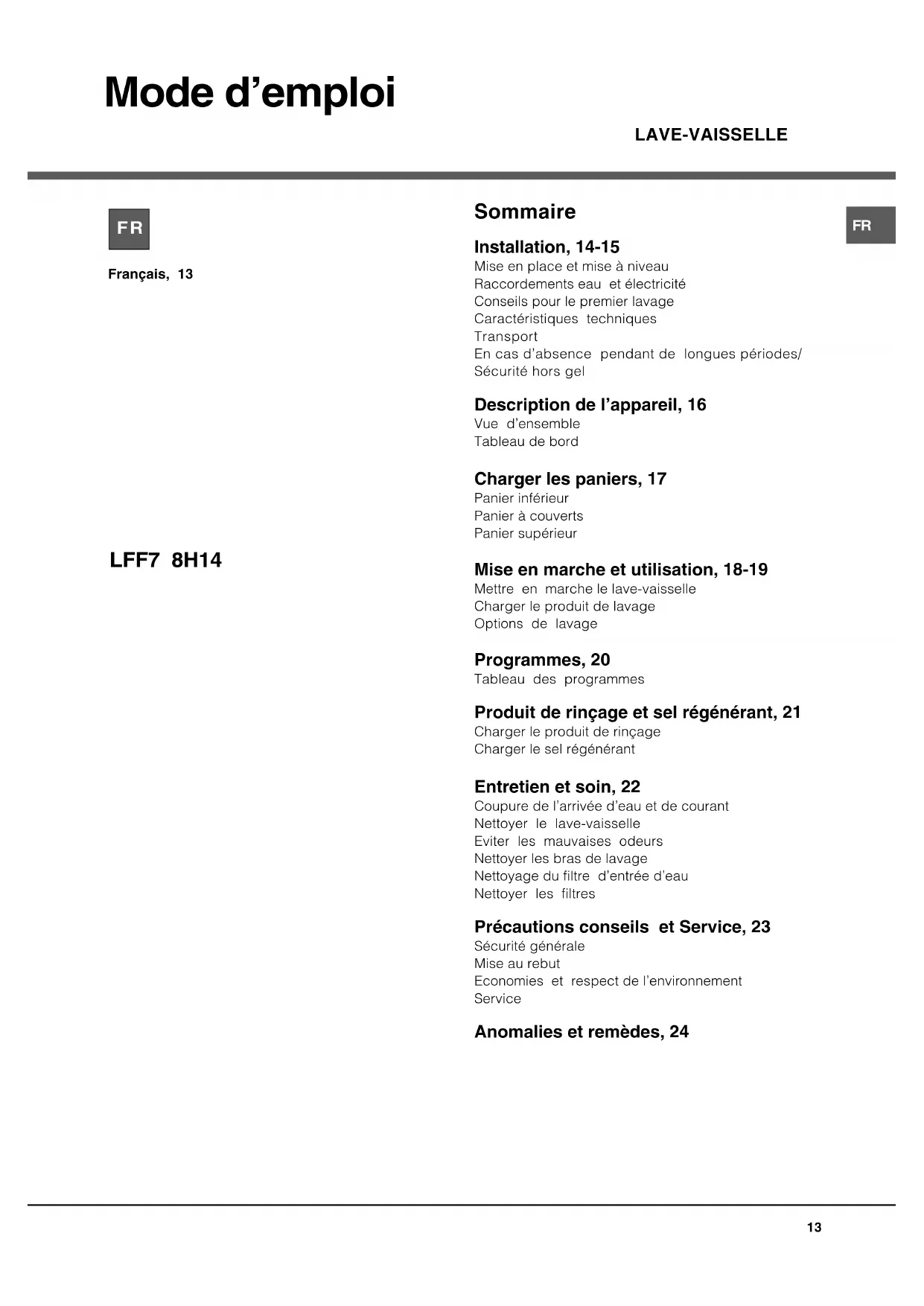 Mode demploi Sommaire Installation, 14-15 Mise en place et mise à niveau Raccordements eau et électricité Conseils pour le premier lavage Caractéristiques techniques Transport En cas dabsence pendant de longues périodes/ Sécurité hors gel Description de lappareil, 16 Vue densemble Tableau de bord Charger les paniers, 17 Panier inférieur Panier à couverts Panier supérieur Mise en marche et utilisation, 18-19 Mettre en marche le lave-vaisselle Charger le produit de lavage Options de lavage Programmes, 20 Tableau des programmes Produit de rinçage et sel régénérant, 21 Charger le produit de rinçage Charger le sel régénérant Entretien et soin, 22 Coupure de larrivée deau et de courant Nettoyer le lave-vaisselle Eviter les mauvaises odeurs Nettoyer les bras de lavage Nettoyage du filtre dentrée deau Nettoyer les filtres Précautions conseils et Service, 23 Sécurité générale Mise au rebut Economies et respect de lenvironnement Service Anomalies et remèdes, 24 Français, 13