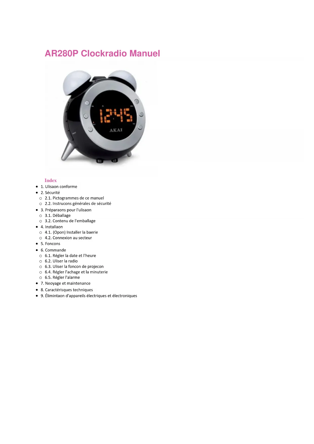 AR280P - Radio-réveil AKAI - Notice d'utilisation et mode d'emploi gratuit