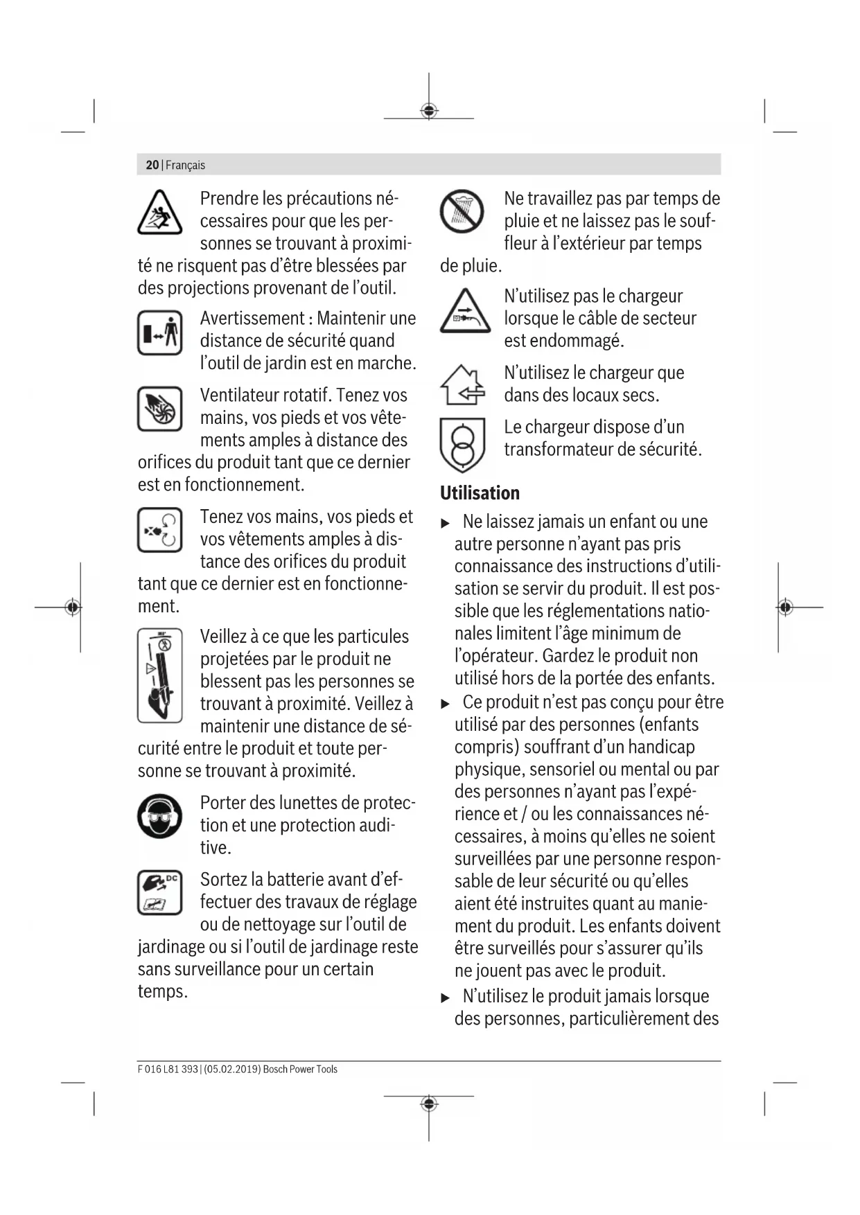 distance de sécurité quand l’outil de jardin est en marche. Ventilateur rotatif. Tenez vos mains, vos pieds et vos vête- ments amples à distance des orifices du produit tant que ce dernier est en fonctionnement. Tenez vos mains, vos pieds et vos vêtements amples à dis- tance des orifices du produit tant que ce dernier est en fonctionne- ment. Veillez à ce que les particules projetées par le produit ne blessent pas les personnes se trouvant à proximité. Veillez à maintenir une distance de sé- curité entre le produit et toute per- sonne se trouvant à proximité. Porter des lunettes de protec- tion et une protection audi- tive. Sortez la batterie avant d’ef- fectuer des travaux de réglage ou de nettoyage sur l’outil de jardinage ou si l’outil de jardinage reste sans surveillance pour un certain temps. Ne travaillez pas par temps de pluie et ne laissez pas le souf- fleur à l’extérieur par temps de pluie. N’utilisez pas le chargeur lorsque le câble de secteur est endommagé. N’utilisez le chargeur que dans des locaux secs. Le chargeur dispose d’un transformateur de sécurité. Utilisation u Ne laissez jamais un enfant ou une autre personne n’ayant pas pris connaissance des instructions d’utili- sation se servir du produit. Il est pos- sible que les réglementations natio- nales limitent l’âge minimum de l’opérateur. Gardez le produit non utilisé hors de la portée des enfants. u Ce produit n’est pas conçu pour être utilisé par des personnes (enfants compris) souffrant d’un handicap physique, sensoriel ou mental ou par des personnes n’ayant pas l’expé- rience et / ou les connaissances né- cessaires, à moins qu’elles ne soient surveillées par une personne respon- sable de leur sécurité ou qu’elles aient été instruites quant au manie- ment du produit. Les enfants doivent être surveillés pour s’assurer qu’ils ne jouent pas avec le produit. u N’utilisez le produit jamais lorsque des personnes, particulièrement des F 016 L81 393 | (05.02.2019) Bosch Power ToolsFrançais | 21 enfants ou animaux domestiques, se trouvent à proximité. u L’utilisateur de la tondeuse est res- ponsable des accidents et des dom- mages causés à autrui ou à leurs biens. u Durant le service, aucune autre per- sonne ni animal ne doit se trouver dans un rayon de 3m autour du pro- duit. Dans la zone de travail, l’opéra- teur est responsable vis-à-vis de tiers. u N’utiliser le produit que de jour ou avec un bon éclairage artificiel. u N’utilisez pas le produit si vous êtes fatigué ou sous l’emprise de drogues, d’alcool ou de médica- ments. u Ne travaillez pas avec le produit dans des conditions météorologiques dé- favorables et plus particulièrement en cas d’approche d’orage. u Lors de l’utilisation de ce produit, toujours porter des vêtements bien ajustés au niveau des bras et du corps u Ne portez pas de chaussures en ca- outchouc ouverts ou des sandalettes quand vous utilisez le produit. Portez toujours des chaussures fermées et des pantalons longs. u Si vous portez des vêtements amples, veillez à ce qu’ils ne soient pas happés par l’alimentation en air; ceci pourrait vous blesser. u Ne faites fonctionner le produit que muni d’une buse. u Si vous avez des cheveux longs, atta- chez-les et veillez à ce qu’ils ne soient pas happés par l’alimentation en air; ceci pourrait vous blesser. u Inspectez soigneusement la surface à travailler et éliminez tous les fils métalliques et autres objets étran- gers. u Avant chaque utilisation, contrôler le câble d’alimentation/la rallonge et, si besoin est, le/la remplacer. Mainte- nir le câble d’alimentation/la rallonge éloigné/e des sources de chaleur, des parties grasses et des bords tranchants. u Toujours ramener le câble vers l’ar- rière du produit. u N’utilisez jamais le produit si les dis- positifs de sécurité sont défectueux, sans coques ou dispositifs de protec- tion tels que le bac de ramassage par ex. u Avant d’utiliser le produit, s’assurer que toutes les poignées et tous les dispositifs de protection fournis avec l’appareil soient bien montés et qu’ils fonctionnent parfaitement. Ne ja- mais essayer de mettre en service un produit incomplet ni sur lequel des modifications non autorisées ont été effectuées. u Veillez lors de l’utilisation du produit à maintenir une position stable qui vous permette de bien garder l’équi- libre. u Prenez conscience de votre environ- nement et de tout danger éventuel Bosch Power Tools F 016 L81 393 | (05.02.2019)22 | Français que vous risquez de ne pas entendre pendant l’utilisation du souffleur. u Évitez un mauvais maintien du corps et veillez à bien maintenir l’équilibre. u Faites attention à ne pas perdre l’équilibre si vous travaillez sur des pentes. u Ne menez l’appareil qu’au pas, ne ja- mais courir. u Veillez à ce que les orifices d’aération ne soient pas obturés. u Ne soufflez jamais les déchets/les feuilles en direction de personnes se trouvant à proximité. u Ne portez pas le produit par le câble. u Il est recommandé de porter un masque respiratoire. u Portez des lunettes de sécurité. u N’effectuez aucune modification sur le produit. Des modifications non autorisées peuvent s’avérer pré- judiciables à la sécurité de votre pro- duit et conduiront à une augmenta- tion des émissions de bruit et des vi- brations. u Un carter ou boîtier endommagé (co- peaux, fissures, entailles) augmente le risque de blessures car il y a risque de projection de corps étrangers. Si le boîtier ou le ventilateur est en- dommagé, contactez la ligne d’assis- tance téléphonique Bosch. Indications pour le maniement optimal de la batterie u N’ouvrez pas l’accu. Risque de court-circuit. Protéger la batterie de toute source de cha- leur, comme par ex. l’exposition directe au soleil, au feu, à l’eau et à l’humidité. Il y a un risque d’explosion. 