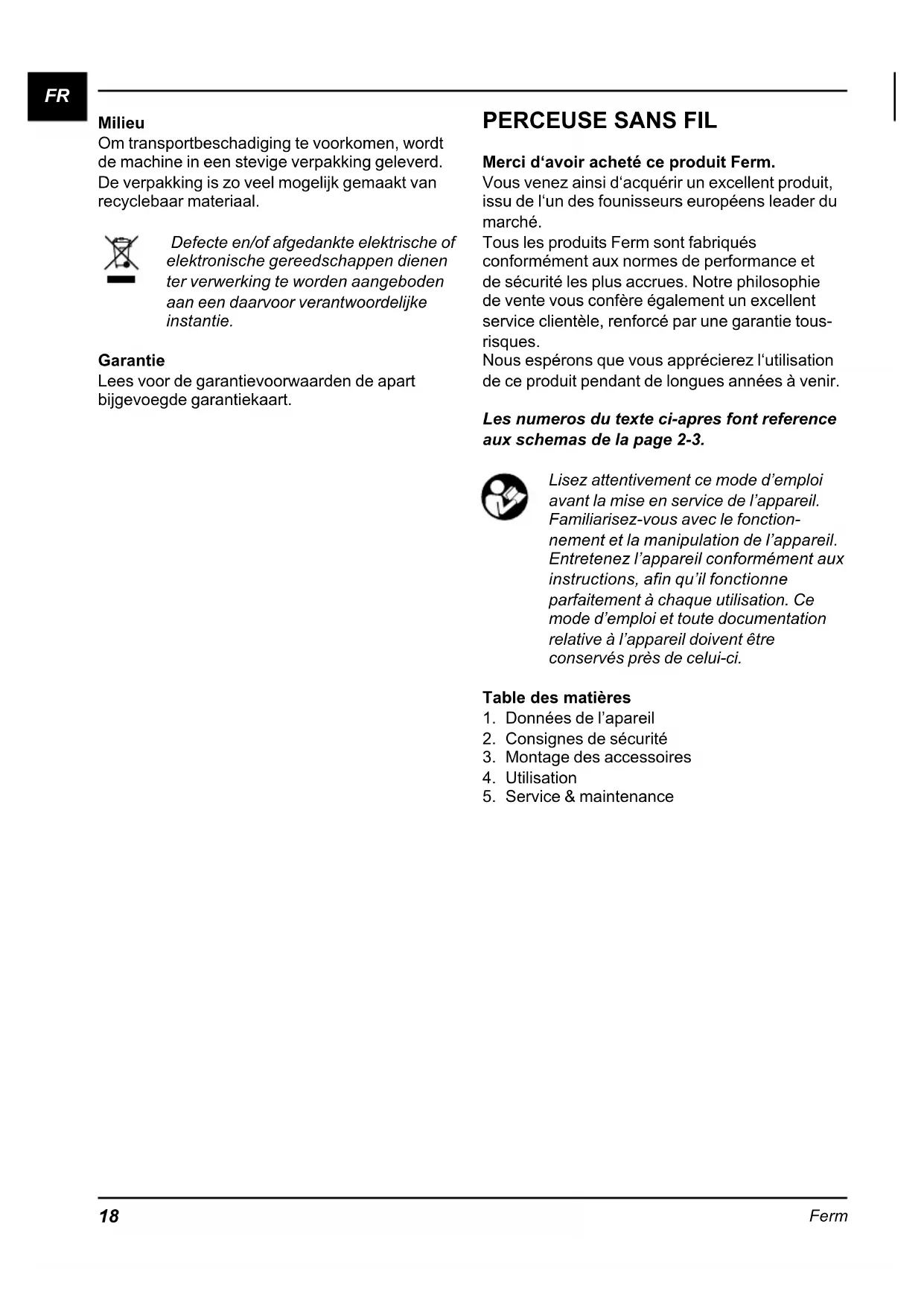 Merci d‘avoir acheté ce produit Ferm. Vous venez ainsi d‘acquérir un excellent produit, issu de l‘un des founisseurs européens leader du marché. Tous les produits Ferm sont fabriqués conformément aux normes de performance et de sécurité les plus accrues. Notre philosophie de vente vous confère également un excellent service clientèle, renforcé par une garantie tous- risques. Nous espérons que vous apprécierez l‘utilisation de ce produit pendant de longues années à venir. Les numeros du texte ci-apres font reference aux schemas de la page 2-3. Lisez attentivement ce mode d’emploi avant la mise en service de l’appareil. Familiarisez-vous avec le fonction- nement et la manipulation de l’appareil. Entretenez l’appareil conformément aux instructions, afin qu’il fonctionne parfaitement à chaque utilisation. Ce mode d’emploi et toute documentation relative à l’appareil doivent être conservés près de celui-ci. Table des matières