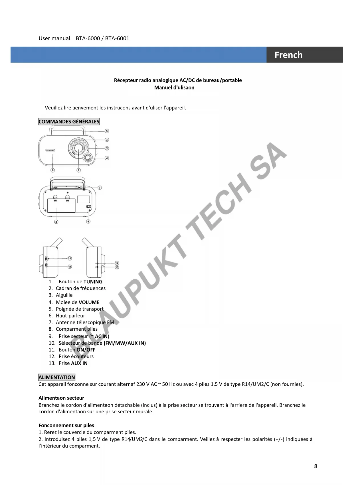 13. Prise AUX IN ALIMENTATION Cet appareil fonctionne sur courant alternatif 230 V AC ~ 50 Hz ou avec 4 piles 1,5 V de type R14/UM2/C (non fournies).