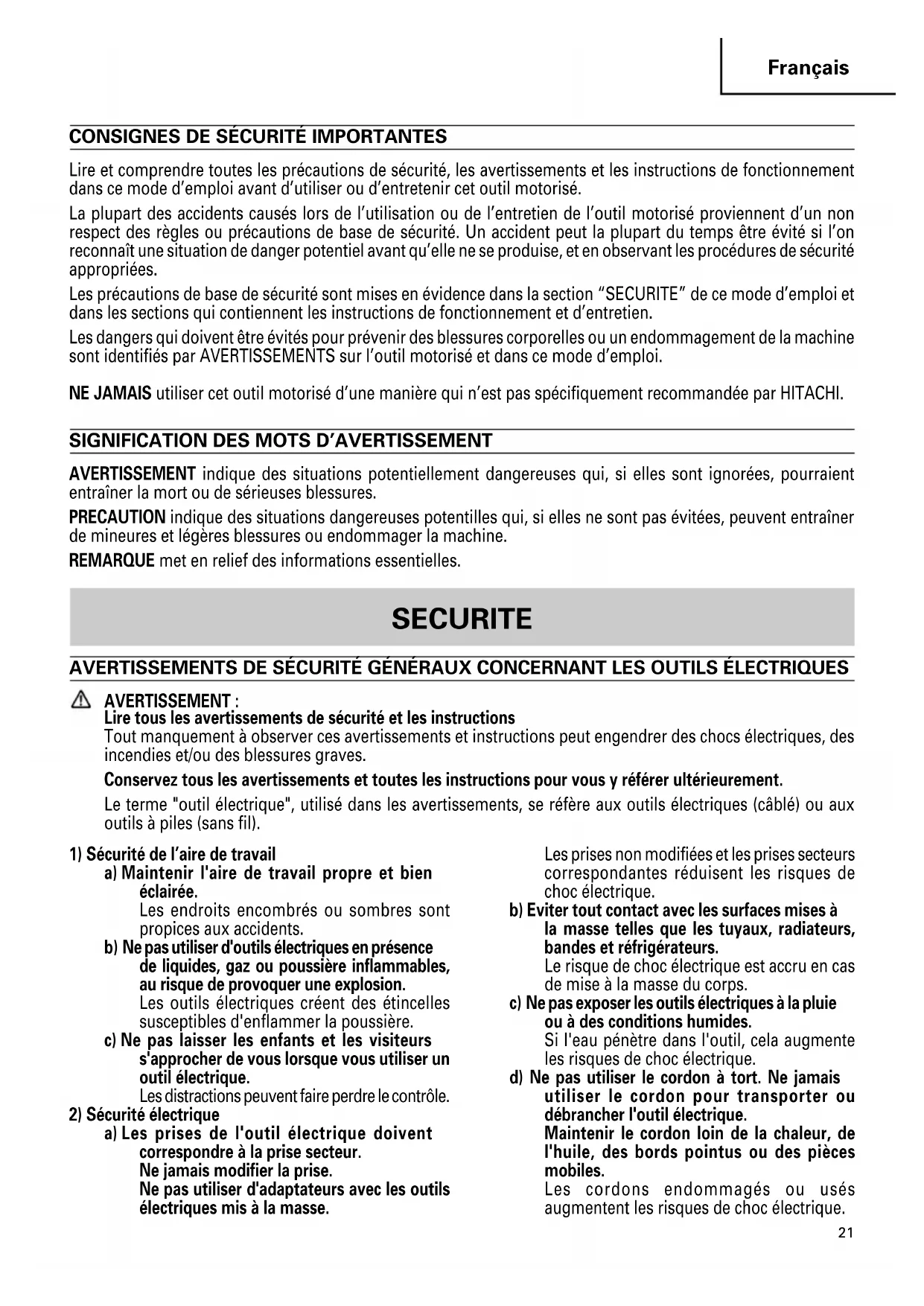 Lire et comprendre toutes les précautions de sécurité, les avertissements et les instructions de fonctionnement dans ce mode d’emploi avant d’utiliser ou d’entretenir cet outil motorisé. La plupart des accidents causés lors de l’utilisation ou de l’entretien de l’outil motorisé proviennent d’un non respect des règles ou précautions de base de sécurité. Un accident peut la plupart du temps être évité si l’on reconnaît une situation de danger potentiel avant qu’elle ne se produise, et en observant les procédures de sécurité appropriées. Les précautions de base de sécurité sont mises en évidence dans la section “SECURITE” de ce mode d’emploi et dans les sections qui contiennent les instructions de fonctionnement et d’entretien. Les dangers qui doivent être évités pour prévenir des blessures corporelles ou un endommagement de la machine sont identifiés par AVERTISSEMENTS sur l’outil motorisé et dans ce mode d’emploi. NE JAMAIS utiliser cet outil motorisé d’une manière qui n’est pas spécifiquement recommandée par HITACHI.
