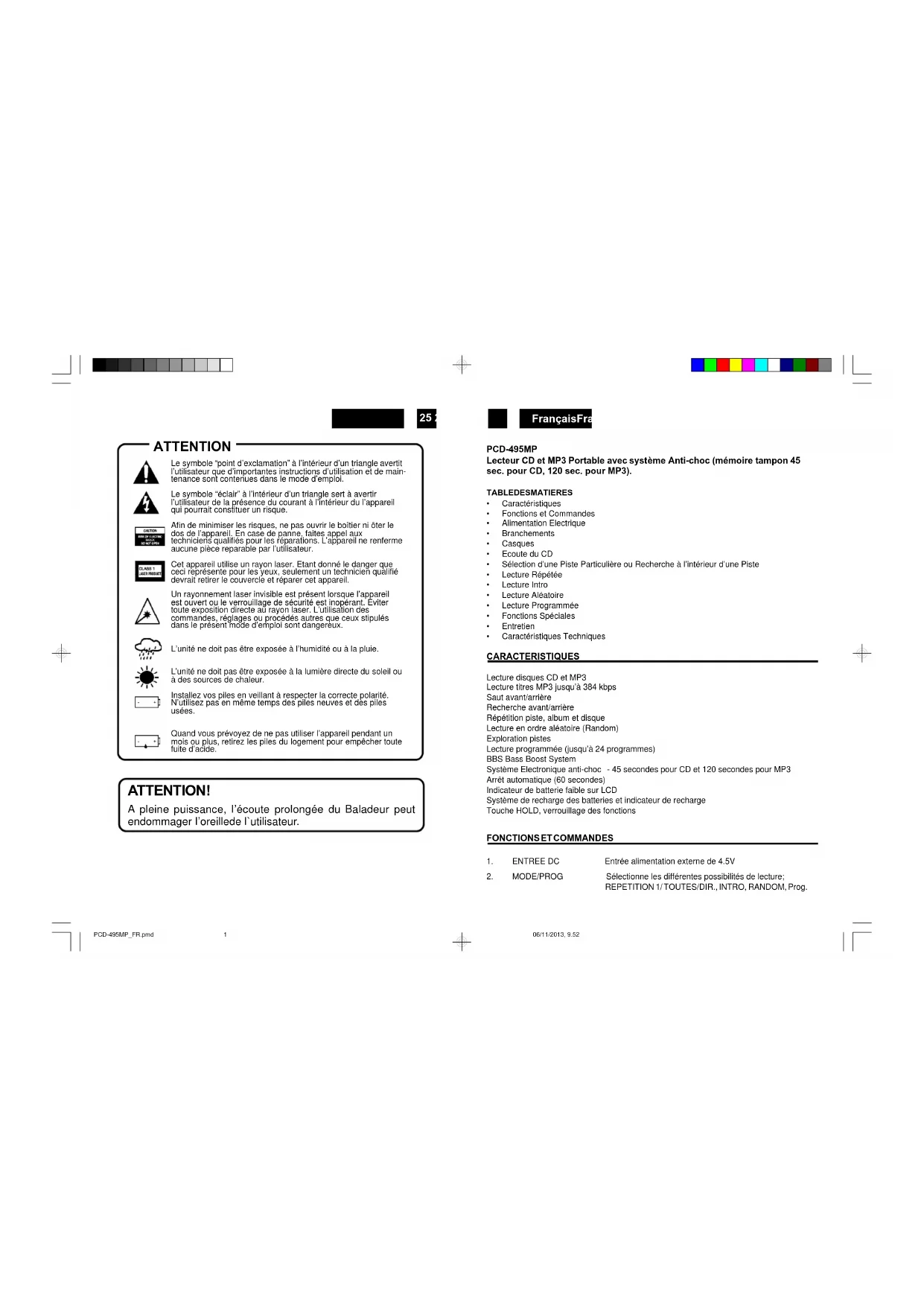 A pleine puissance, l'écoute prolongée du Baladeur peut endommager l'oreillede l'utilisateur.