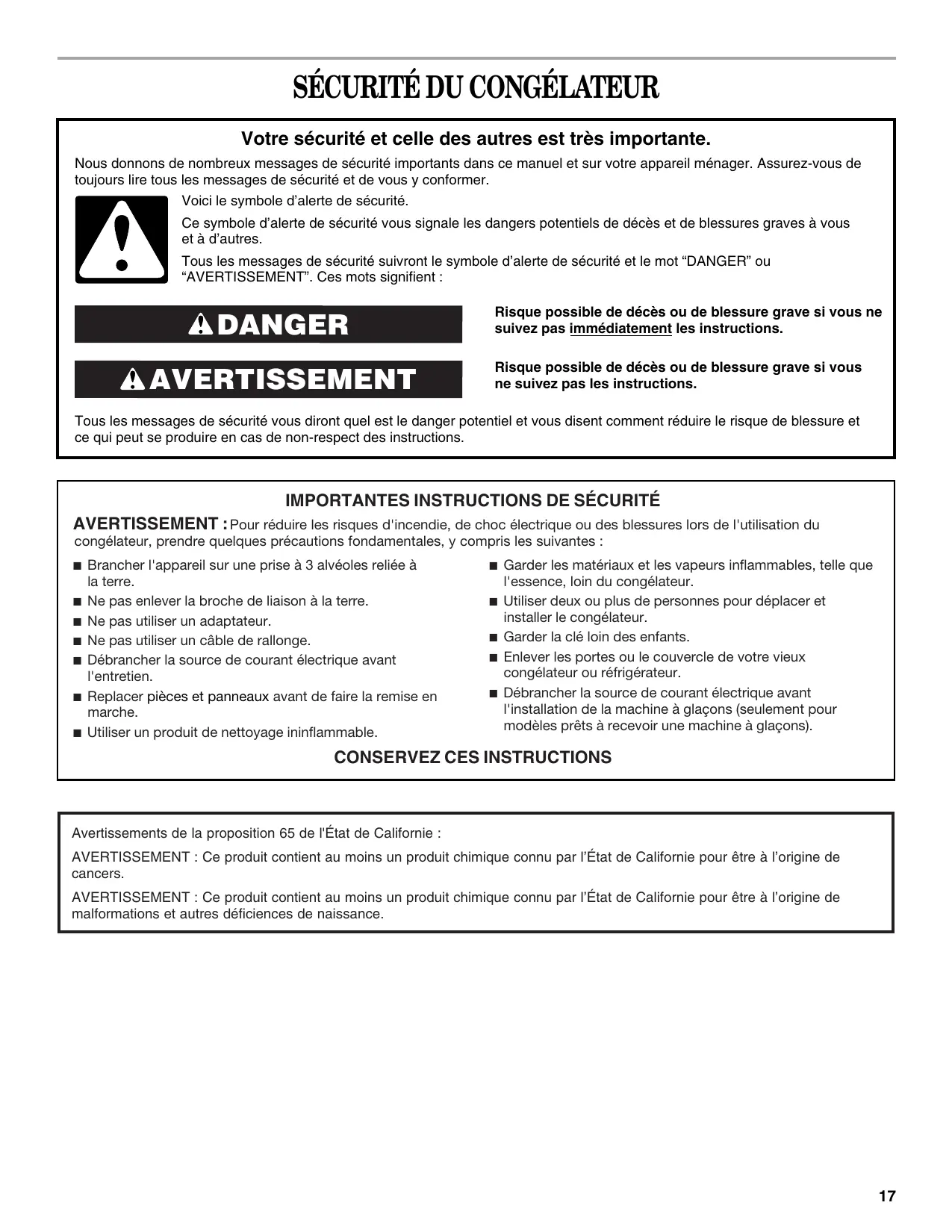 Garder les matériaux et les vapeurs inflammables, telle que l'essence, loin du congélateur. Utiliser deux ou plus de personnes pour déplacer et installer le congélateur. Garder la clé loin des enfants. Enlever les portes ou le couvercle de votre vieux congélateur ou réfrigérateur. Débrancher la source de courant électrique avant l'installation de la machine à glaçons (seulement pour modèles prêts à recevoir une machine à glaçons).