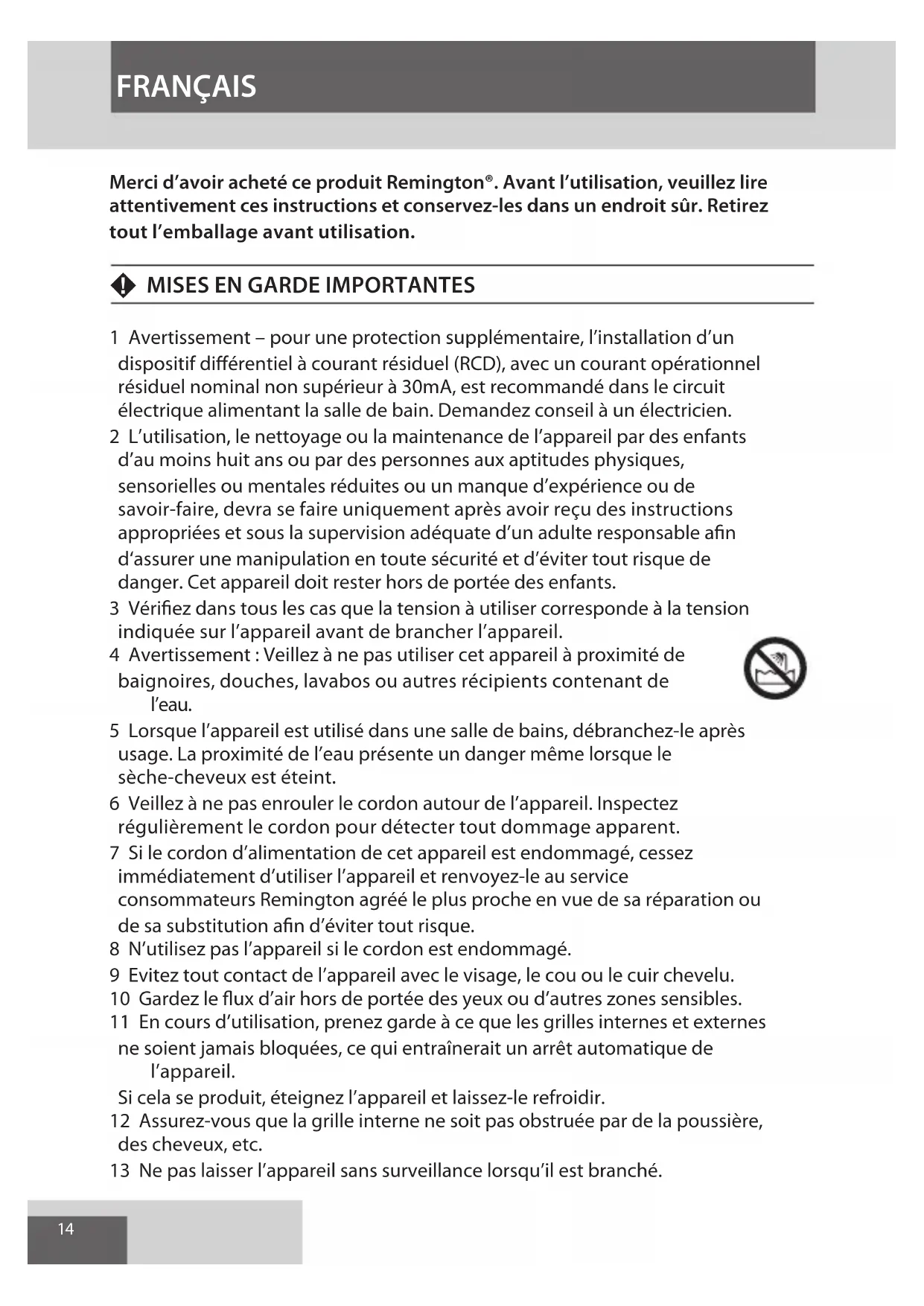 1 Avertissement – pour une protection supplémentaire, l’installation d’un dispositif différentiel à courant résiduel (RCD), avec un courant opérationnel résiduel nominal non supérieur à 30mA, est recommandé dans le circuit électrique alimentant la salle de bain. Demandez conseil à un électricien. 2 L’utilisation, le nettoyage ou la maintenance de l’appareil par des enfants d’au moins huit ans ou par des personnes aux aptitudes physiques, sensorielles ou mentales réduites ou un manque d’expérience ou de savoir-faire, devra se faire uniquement après avoir reçu des instructions appropriées et sous la supervision adéquate d’un adulte responsable afin d‘assurer une manipulation en toute sécurité et d’éviter tout risque de danger. Cet appareil doit rester hors de portée des enfants. 3 Vérifiez dans tous les cas que la tension à utiliser corresponde à la tension indiquée sur l’appareil avant de brancher l’appareil. 4 Avertissement : Veillez à ne pas utiliser cet appareil à proximité de baignoires, douches, lavabos ou autres récipients contenant de l’eau. 5 Lorsque l’appareil est utilisé dans une salle de bains, débranchez-le après usage. La proximité de l’eau présente un danger même lorsque le sèche-cheveux est éteint. 6 Veillez à ne pas enrouler le cordon autour de l’appareil. Inspectez régulièrement le cordon pour détecter tout dommage apparent. 7 Si le cordon d’alimentation de cet appareil est endommagé, cessez immédiatement d’utiliser l’appareil et renvoyez-le au service consommateurs Remington agréé le plus proche en vue de sa réparation ou de sa substitution afin d’éviter tout risque. 8 N’utilisez pas l’appareil si le cordon est endommagé. 9 Evitez tout contact de l’appareil avec le visage, le cou ou le cuir chevelu. 10 Gardez le flux d’air hors de portée des yeux ou d’autres zones sensibles. 11 En cours d’utilisation, prenez garde à ce que les grilles internes et externes ne soient jamais bloquées, ce qui entraînerait un arrêt automatique de l’appareil. Si cela se produit, éteignez l’appareil et laissez-le refroidir. 12 Assurez-vous que la grille interne ne soit pas obstruée par de la poussière, des cheveux, etc. 13 Ne pas laisser l’appareil sans surveillance lorsqu’il est branché. FRANÇAIS15 14 Ne déposez pas l’appareil sur une surface quand il est encore en fonctionnement. 15 Ne pas placer l’appareil sur des tissus d’ameublement. 16 Ne pas utiliser d’autres accessoires que ceux fournis. 17 N’utilisez pas le diffuseur sur la position de réglage de température la plus élevée. 18 Cet appareil n’est pas destiné à une utilisation commerciale ou en salon. 19 Laissez les accessoires refroidir avant de les démonter. 20 Laissez l’appareil refroidir avant de le nettoyer et de le ranger.