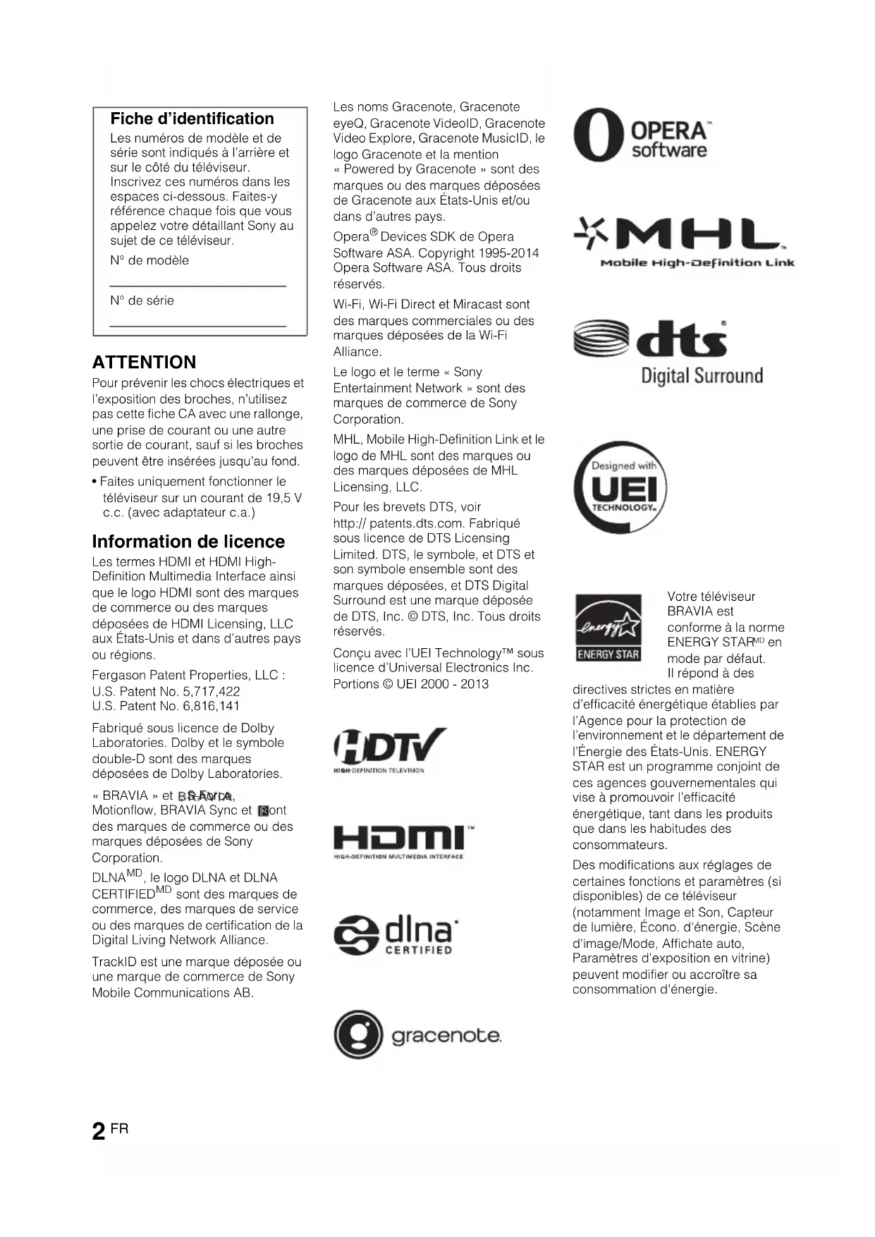 REMARQUE SUR L’ADAPTATEUR CA Avertissement Pour réduire le risque d’incendie ou d’électrocution, n’exposez pas cet appareil à la pluie ou à l’humidité.Pour prévenir les incendies ou électrocutions, ne placez pas d’objets remplis de liquide, tels que des vases, sur l’appareil.N’installez pas cet équipement dans un espace confiné, tel que dans une bibliothèque ou un meuble encastré. Déclaration de conformité Appellation commerciale: SONYModèle: KDL-48W600B/KDL-48W590B/KDL-48W580B/KDL-40W600B/KDL-40W590B/KDL-40W580BPartie responsable: Sony Electronics Inc.Adresse : 16530 Via Esprillo, San Diego, CA 92127 U.S.A.Numéro de téléphone : 858-942-2230Cet appareil est conforme à la section 15 des règlements de la FCC. L’utilisation de ce dispositif est autorisée seulement aux conditions suivantes : (1) Cet appareil ne doit pas provoquer des interférences gênantes; et (2) cet appareil doit pouvoir accepter les interférences reçues, y compris les interférences risquant de déclencher des opérations non désirées.Conformément aux règlements de la FCC, vous êtes averti que tous les changements ou modifications non expressément approuvés dans ce manuel pourraient annuler tous vos droits relatifs à l’utilisation de ce produit. (Suite)D:\SONY TV\SY140189_Clover 6 (Rev 4)\4489955141_CF\CF07PRE.fm