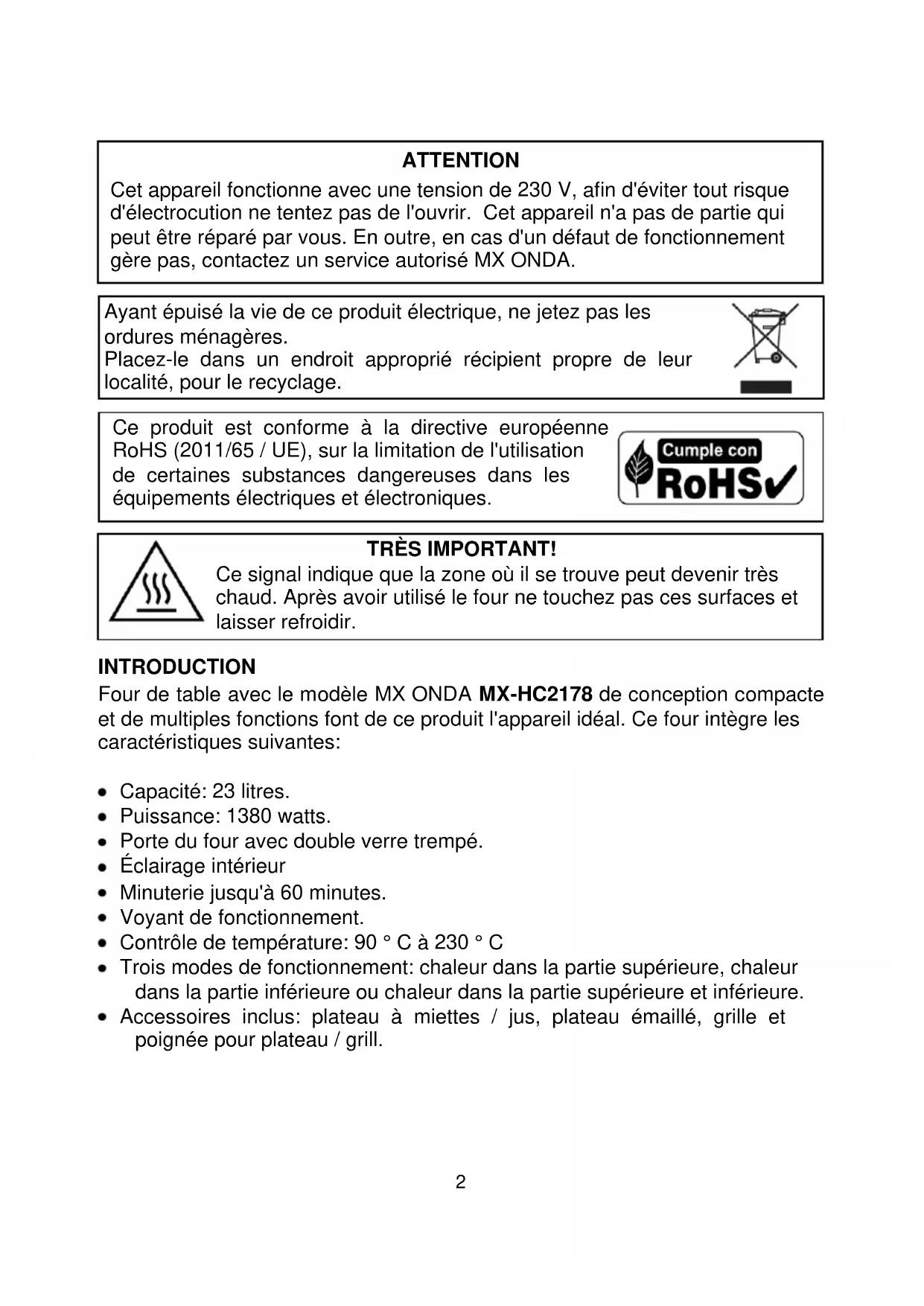 Retrouvez gratuitement la notice de l'appareil MXHC2178 Mx Onda au format PDF.