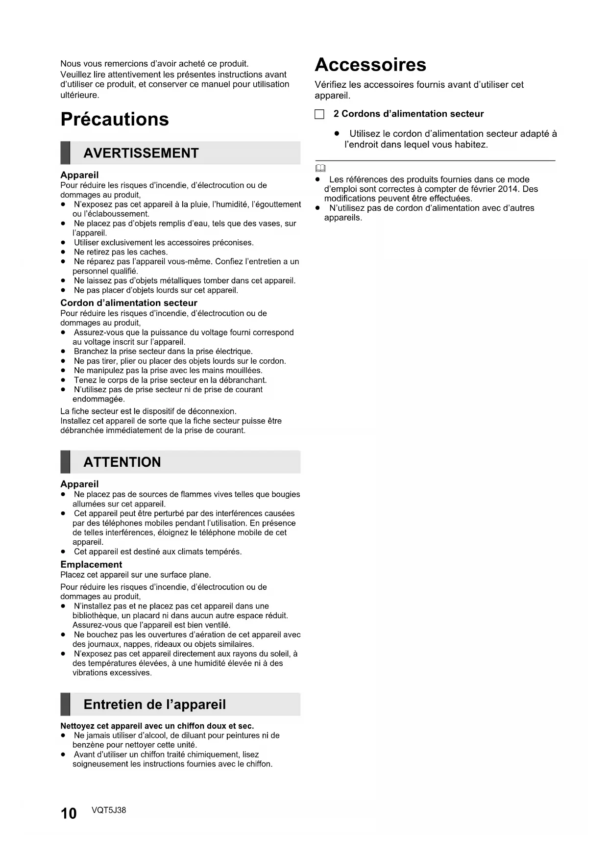 ≥ Les références des produits fournies dans ce mode d’emploi sont correctes à compter de février 2014. Des modifications peuvent être effectuées. ≥ N’utilisez pas de cordon d’alimentation avec d’autres appareils. AVERTISSEMENT ATTENTION Entretien de l’appareil SH-FX82-VQT5J38_mst.book 10 ページ 2014年3月11日 火曜日 午前10時30分11 VQT5J38Français Guide de référence de la commande Schéma d’installation sans fil ≥ Pour éviter les interférences, éloignez le système sans fil des autres dispositifs électroniques qui utilisent la même fréquence radio (bande de 2,4 GHz).≥ Placez le système sans fil à environ 10 m du système de cinéma maison. ≥ Pour permettre une bonne ventilation et un maintien correct de la circulation de l'air autour du système sans fil, placez-le avec au moins 5 cm d'espace de chaque coté.≥ N'utilisez pas le système sans fil dans un placard métallique. ≥ N’essayez pas de connecter des enceintes ambiophoniques supplémentaire au système de cinéma maison. Connexions Eteignez tous les appareils avant le branchement.Ne connectez pas le fil d’alimentation CA tant que toutes les autres connexions n’ont pas été effectuées.1 Indicateur de liaison sans filVert fixe : La liaison sans fil est activée.clignotant (lentement) : Mode rechercheclignotant (rapidement) : Mode appairageRouge fixe : Mode sommeil2 Active l’appairage3 Prises de l’enceinte4Prise AC INA Système de cinéma maisonB Position d’assiseC Système sans filD Câbles de l’enceinte ambiophonique (non fourni)WIRELESS LINK