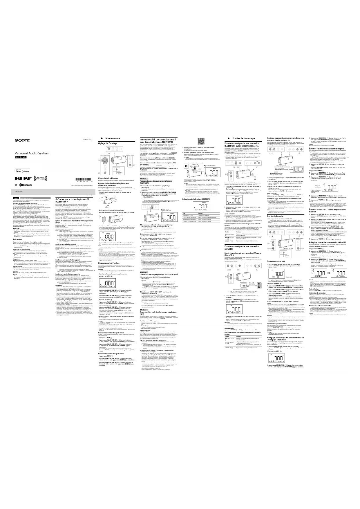 Français Système audio personnelAvant d’utiliser le système, lisez attentivement ce guide et conservez-le afin de pouvoir le consulter ultérieurement.À propos des droits d’auteur et des licencesLa marque BLUETOOTH® et les logos appartiennent à Bluetooth SIG, Inc. et doivent être utilisés par Sony Corporation uniquement sous licence.La marque N est une marque commerciale ou une marque commerciale déposée de NFC Forum, Inc., aux États-Unis et dans d’autres pays.Android et Google Play sont des marques commerciales de Google Inc.iPad, iPhone, iPod, iPod classic, iPod nano, iPod touch et Mac sont des marques d’Apple Inc., déposées aux États-Unis et dans d’autres pays.Lightning est une marque de commerce de Apple Inc.«Conçu pour iPod » et « Conçu pour iPhone » signifient que l’accessoire électronique a été conçu spécifiquement pour être raccordé à un iPod ou un iPhone, respectivement, et qu’il est certifié par le développeur comme étant conforme aux normes de performances d’Apple. Apple n’est pas responsable du fonctionnement de ce périphérique ou de sa compatibilité avec les normes de sécurité et réglementaires. Veuillez noter que l’utilisation de cet accessoire avec un iPod ou un iPhone peut affecter les performances sans fil.No Power No Problem est une marque commerciale de Sony Corporation.Les autres marques commerciales et noms commerciaux appartiennent à leurs propriétaires respectifs.Remarques Ce système n’est pas conçu pour être utilisé avec un iPad via une connexion USB et risque de ne pas fonctionner correctement si vous l’utilisez de cette manière. Dans ce mode d’emploi, le terme « iPod » est utilisé comme terme générique pour désigner les fonctions d’un iPhone, iPad ou iPod, sauf mention contraire stipulée dans le texte ou les illustrations. Précautions Remarque lors de l’utilisation d’un téléphone mobile Pour plus de détails sur le fonctionnement de votre téléphone mobile lorsque vous recevez un appel et que vous transmettez des données audio à l’aide de la connexion BLUETOOTH, reportez-vous au mode d’emploi fourni avec votre téléphone mobile.Remarques sur la fiche secteur Branchez la fiche secteur sur la prise murale la plus proche. En cas de dysfonctionnement, retirez immédiatement la fiche de la prise murale. Ne tordez pas le cordon de la fiche secteur et ne posez pas d’objet lourd dessus. Pour débrancher l’alimentation secteur, saisissez la fiche proprement dite et non le cordon.Rangement N’installez pas le haut-parleur en position inclinée. Ne placez pas le système à proximité d’une source de chaleur ou dans un endroit exposé aux rayons directs du soleil, à une poussière excessive ou à des chocs mécaniques et gardez-le à l’abri de l’humidité ainsi que de la pluie.Fonctionnement N’insérez pas de petits objets, etc. dans les prises. Cela risquerait de provoquer un court-circuit ou un dysfonctionnement du système.Entretien N’utilisez pas d’alcool, d’essence ou de diluant pour nettoyer le boîtier.Autres Si vous avez des questions ou des problèmes concernant ce système, qui ne sont pas abordés dans ce mode d’emploi, contactez votre revendeur Sony le plus proche. Qu’est-ce que la technologie sans fil