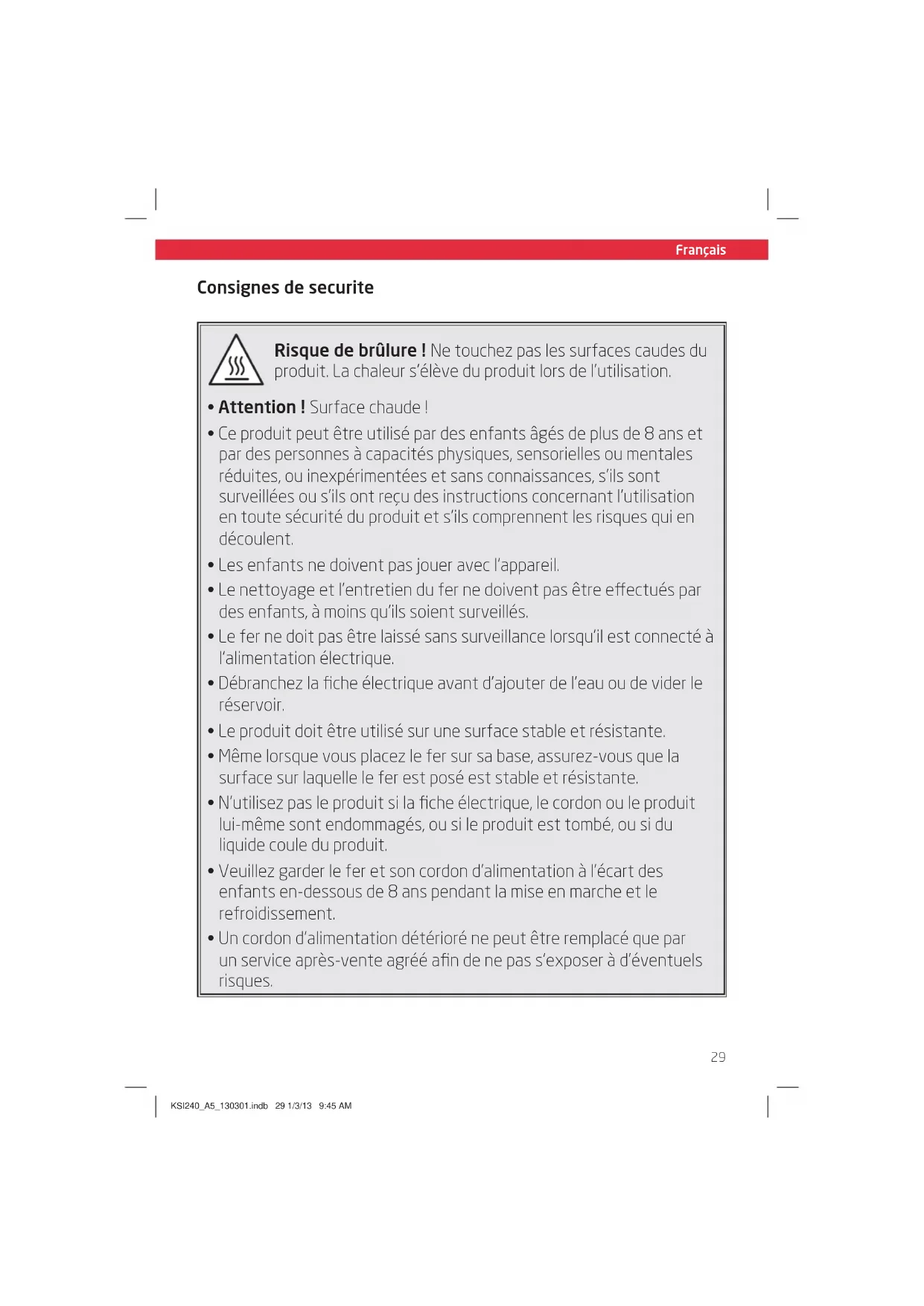 Consignes de securite Risque de brûlure! Ne touchez pas les surfaces caudes du produit. La chaleur s’élève du produit lors de l’utilisation. ŒAttention! Surface chaude! ŒCe produit peut être utilisé par des enfants âgés de plus de 8 ans et par des personnes à capacités physiques, sensorielles ou mentales réduites, ou inexpérimentées et sans connaissances, s'ils sont surveillées ou s’ils ont reçu des instructions concernant l'utilisation en toute sécurité du produit et s’ils comprennent les risques qui en découlent. ŒLes enfants ne doivent pas jouer avec l'appareil. ŒLe nettoyage et l’entretien du fer ne doivent pas être eectués par des enfants, à moins qu’ils soient surveillés. ŒLe fer ne doit pas être laissé sans surveillance lorsqu'il est connecté à l'alimentation électrique. ŒDébranchez la fiche électrique avant d'ajouter de l'eau ou de vider le réservoir. ŒLe produit doit être utilisé sur une surface stable et résistante. ŒMême lorsque vous placez le fer sur sa base, assurez-vous que la surface sur laquelle le fer est posé est stable et résistante. ŒN'utilisez pas le produit si la fiche électrique, le cordon ou le produit lui-même sont endommagés, ou si le produit est tombé, ou si du liquide coule du produit. ŒVeuillez garder le fer et son cordon d’alimentation à l’écart des enfants en-dessous de 8 ans pendant la mise en marche et le refroidissement. ŒUn cordon d’alimentation détérioré ne peut être remplacé que par un service après-vente agréé afin de ne pas s’exposer à d’éventuels risques. KSI240_A5_130301.indb 29 1/3/13 9:45 AMFrançais