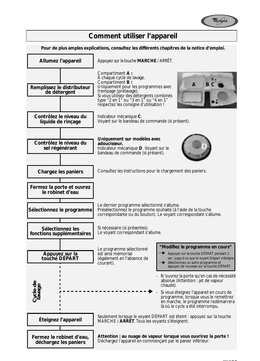 Comment utiliser l’appareil Pour de plus amples explications, consultez les différents chapitres de la notice d’emploi. Allumez l’appareil Appuyez sur la touche MARCHE / ARRÊT. Remplissez le distributeur de détergent Compartiment A : À chaque cycle de lavage. Compartiment B : Uniquement pour les programmes avec trempage (prélavage). Si vous utilisez des détergents combinés type “2 en 1” ou “3 en 1” ou “4 en 1” respectez les consigne d’utilisation ! Contrôlez le niveau du liquide de rinçage Indicateur mécanique C. Voyant sur le bandeau de commande (si présent). Contrôlez le niveau du sel régénérant Uniquement sur modèles avec adoucisseur. Indicateur mécanique D. Voyant sur le bandeau de commande (si présent). Chargez les paniers