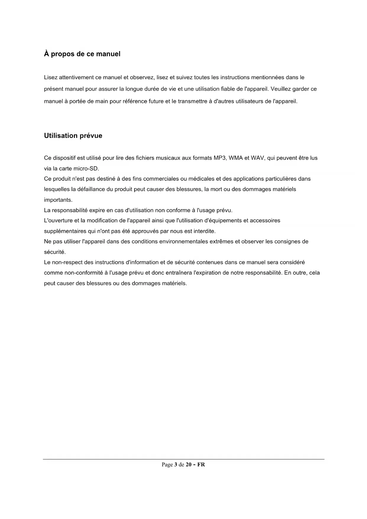 - 8. Mise au rebut des appareils électriques utilisés Page 3 de 20 - FR À propos de ce manuel Lisez attentivement ce manuel et observez, lisez et suivez toutes les instructions mentionnées dans le présent manuel pour assurer la longue durée de vie et une utilisation fiable de l'appareil. Veuillez garder ce manuel à portée de main pour référence future et le transmettre à d'autres utilisateurs de l'appareil. Utilisation prévue Ce dispositif est utilisé pour lire des fichiers musicaux aux formats MP3, WMA et WAV, qui peuvent être lus via la carte micro-SD. Ce produit n'est pas destiné à des fins commerciales ou médicales et des applications particulières dans lesquelles la défaillance du produit peut causer des blessures, la mort ou des dommages matériels importants. La responsabilité expire en cas d'utilisation non conforme à l'usage prévu. L'ouverture et la modification de l'appareil ainsi que l'utilisation d'équipements et accessoires supplémentaires qui n'ont pas été approuvés par nous est interdite. Ne pas utiliser l'appareil dans des conditions environnementales extrêmes et observer les consignes de sécurité. Le non-respect des instructions d'information et de sécurité contenues dans ce manuel sera considéré comme non-conformité à l'usage prévu et donc entraînera l'expiration de notre responsabilité. En outre, cela peut causer des blessures ou des dommages matériels.Page 4 de 20 - FR Consignes Lisez et suivez ces instructions d'utilisation, y compris tous les avertissements et les instructions à suivre avant la première utilisation du produit. Avant la première utilisation de l'appareil, assurez-vous que la batterie est complètement chargée. Éviter les chocs forts sur l'appareil. Ne pas utiliser l'appareil dans des conditions de froid, de chaleur, d'humidité ou de poussière extrêmes. Ne pas exposer à la lumière directe du soleil. Ne pas placer le produit à proximité de sources de lumière directes, par exemple près de bougies. Effectuez des sauvegardes régulières de vos données afin d'éviter toute perte de données. Évitez l'utilisation dans de champs magnétiques élevés. Ne pas utiliser cet appareil avec les mains mouillées. Protégez l'appareil de l'eau. Si de l'humidité pénètre dans l'appareil, éteignez-le immédiatement, nettoyez et laissez sécher. Ne pas utiliser d'eau ou de solutions chimiques pour nettoyer l'appareil. Utilisez uniquement un chiffon sec. Nous ne sommes pas responsables des dommages ou des pertes de données en cas de dysfonctionnement, d'utilisation abusive, de réparation ou de remplacement volontaire de votre batterie. Ne pas démonter l'appareil et ses différents composants et ne pas essayer de réparer vous-même, sinon la garantie sera annulée. Ne pas obstruer ou recouvrir les ouvertures du produit. Ce produit est destiné à un usage privé et ne doit pas être utilisé à des fins commerciales ou industrielles. Ne pas insérer d'objets inappropriés dans les ouvertures du produit. La garantie ne couvre pas les dommages résultant d'une mauvaise utilisation ou du défaut de respect des avertissements ou des instructions de ce manuel d'instructions. p. 20