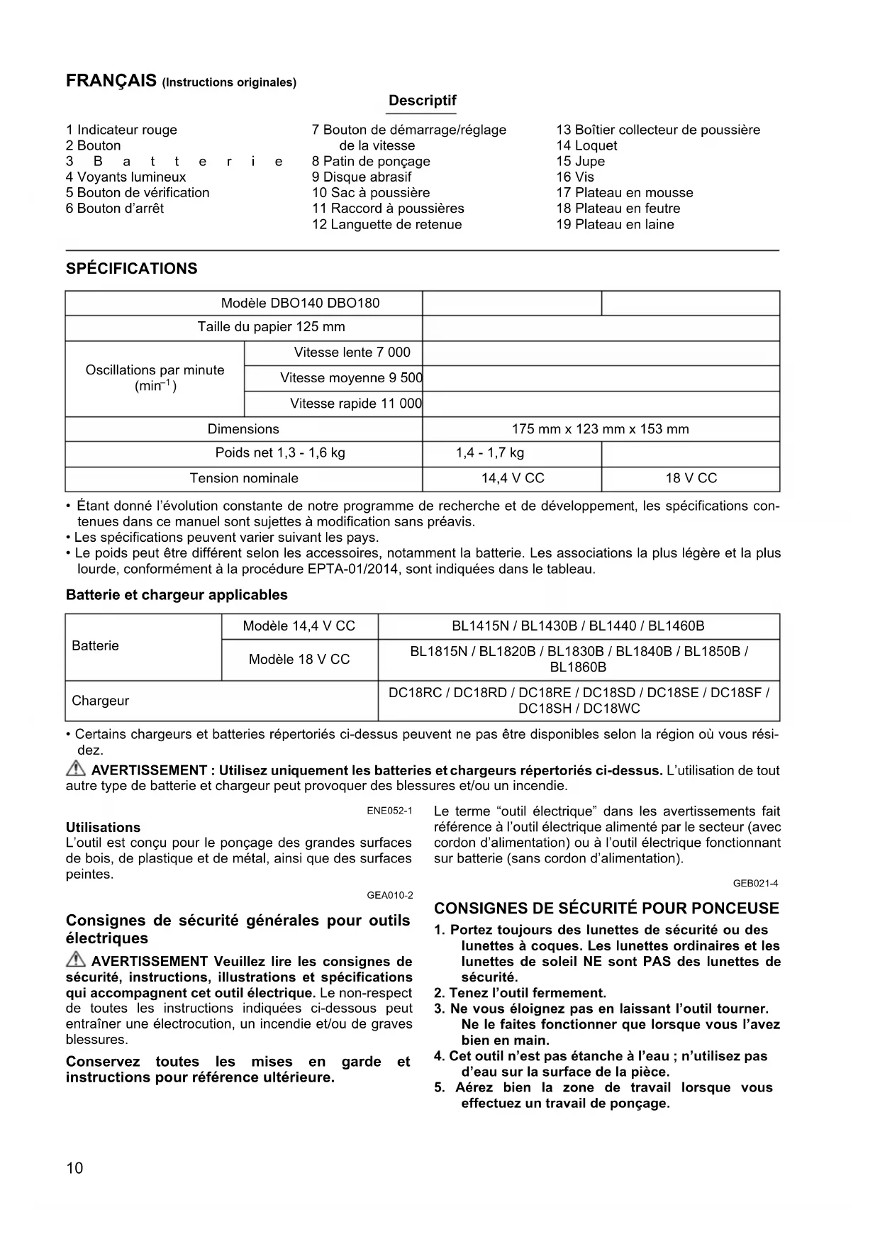 sur batterie (sans cordon d’alimentation). GEB021-4 CONSIGNES DE SÉCURITÉ POUR PONCEUSE