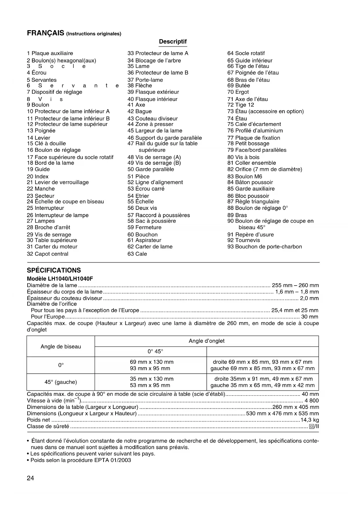 SPÉCIFICATIONS Modèle LH1040/LH1040F Diamètre de la lame 255 mm – 260 mm