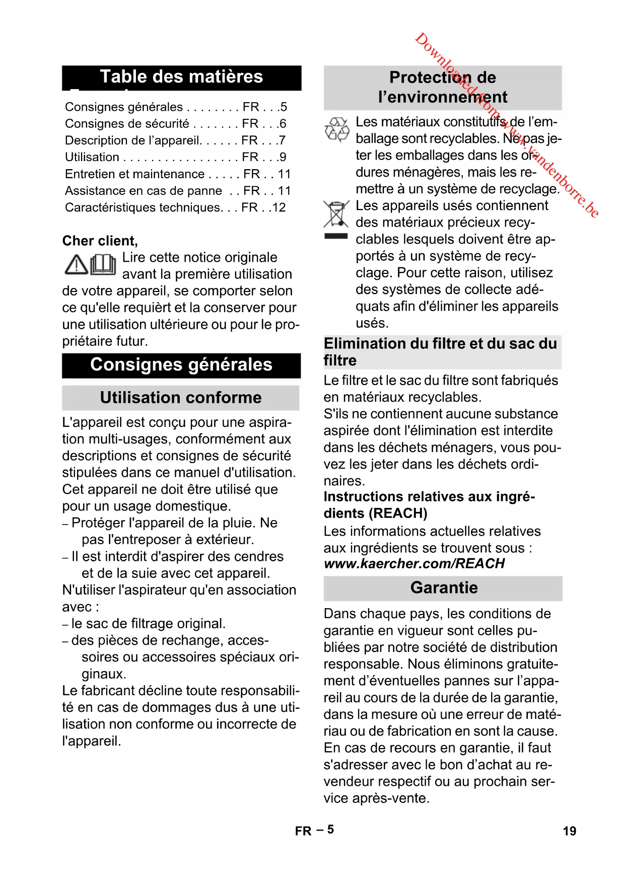 • FR Consignes générales Utilisation conforme Protection de l’environnement Elimination du filtre et du sac du filtre Garantie 19FR Downloaded from www.vandenborre.be– 6 Notre succursale Kärcher p. 12