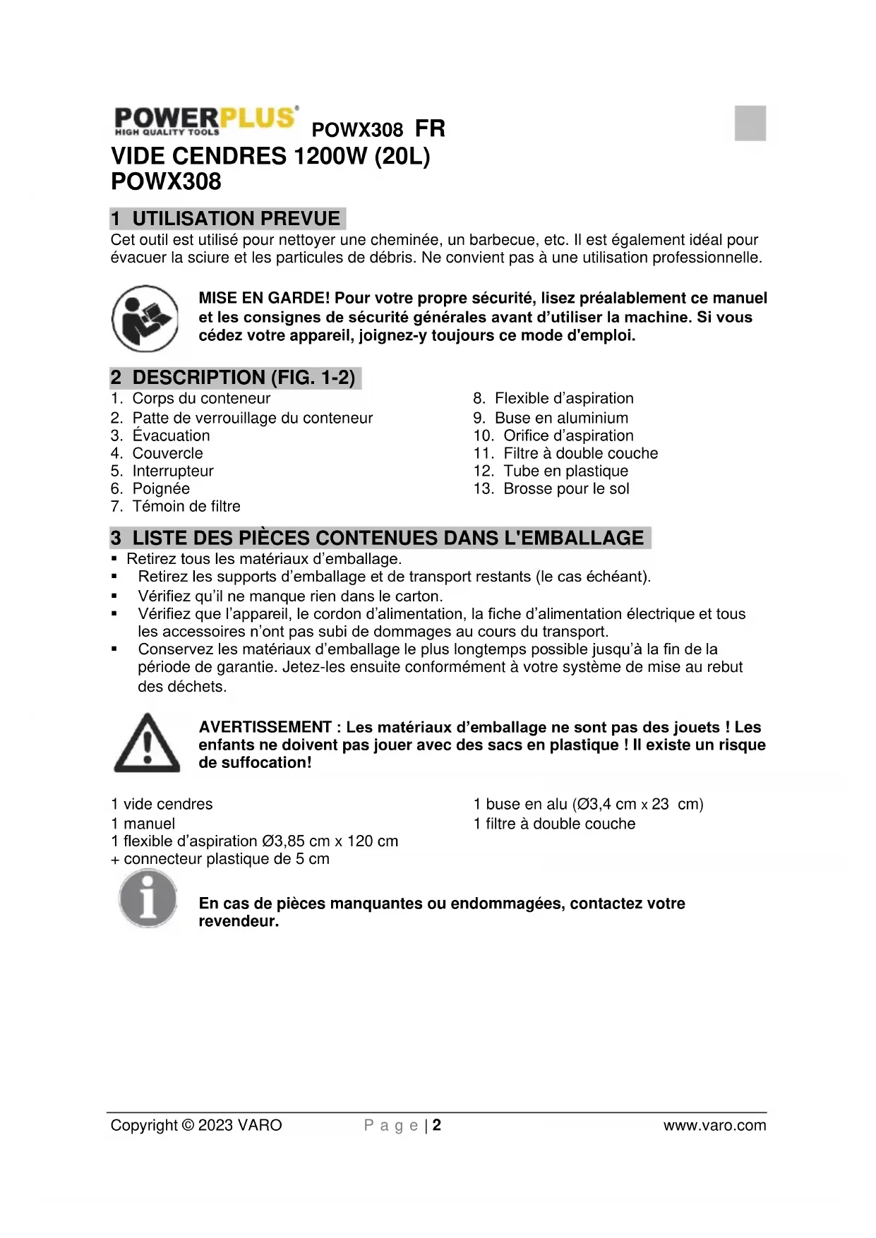 Copyright © 2023 VARO P a g e | 2 www.varo.com VIDE CENDRES 1200W (20L) POWX308 1 UTILISATION PREVUE Cet outil est utilisé pour nettoyer une cheminée, un barbecue, etc. Il est également idéal pour évacuer la sciure et les particules de débris. Ne convient pas à une utilisation professionnelle. MISE EN GARDE! Pour votre propre sécurité, lisez préalablement ce manuel et les consignes de sécurité générales avant d’utiliser la machine. Si vous cédez votre appareil, joignez-y toujours ce mode d'emploi. 2 DESCRIPTION (FIG. 1-2)