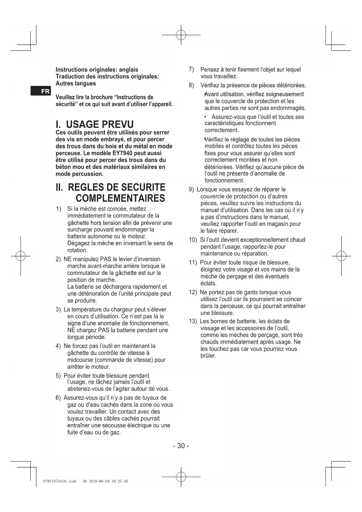Téléchargez la notice de votre Perceuse au format PDF gratuitement ! Retrouvez votre notice EY7441 - PANASONIC et reprennez votre appareil électronique en main. Sur cette page sont publiés tous les documents nécessaires à l'utilisation de votre appareil EY7441 de la marque PANASONIC.